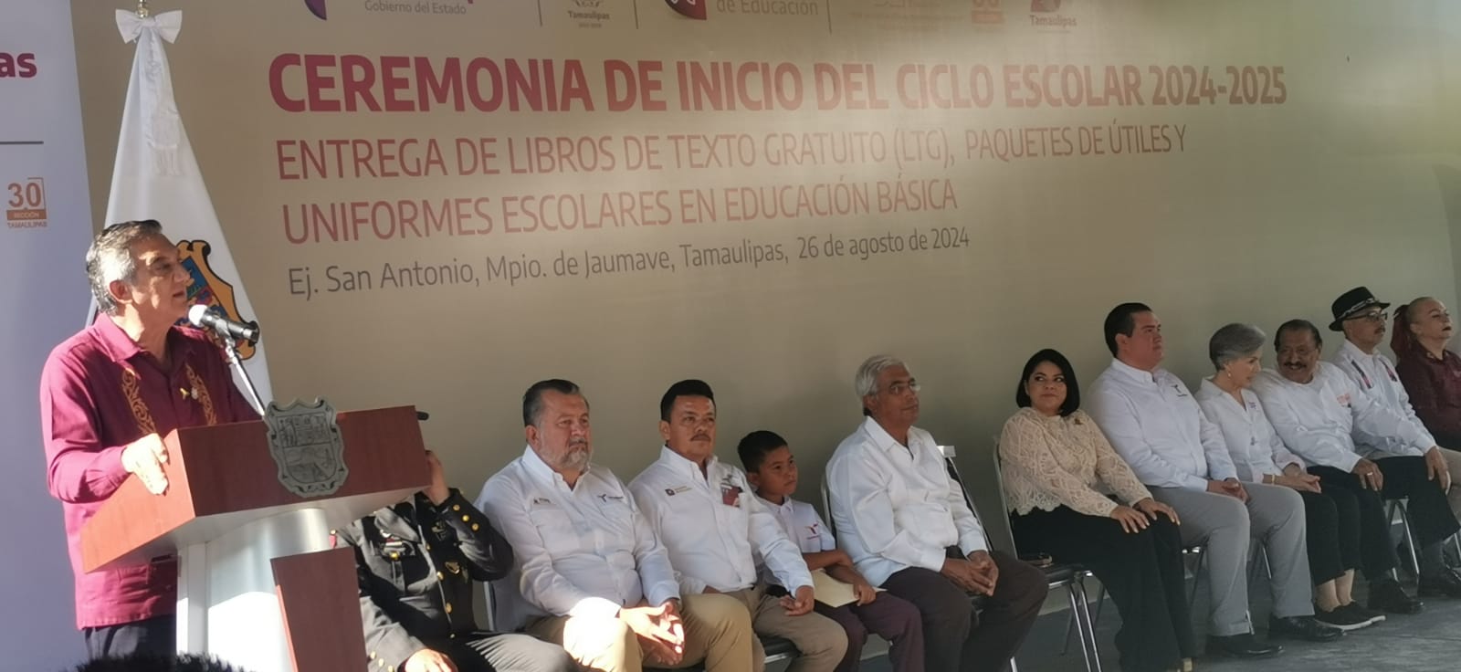 Durante la ceremonia cívica en la Escuela Primaria Francisco Zarco, del ejido San Antonio, municipio de Jaumave, y acompañado por la presidenta del DIF Tamaulipas, doctora María de Villarreal; el secretario general de la Sección 30 del SNTE, Arnulfo Rodríguez Treviño, y Rodrigo Castillo Aguilar, representante de la secretaria de Educación federal Leticia Ramírez Amaya, el gobernador entregó paquetes de útiles, uniformes y libros de texto gratuitos, ahí reiteró que su gobierno estará atento para mejorar las instalaciones educativas a través del ITIFE.