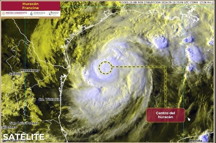 Ciudad Victoria, Tamaulipas (10 de septiembre de 2024).- Esta tarde, Francine se ha intensificado a huracán de categoría uno en la escala Saffir-Simpson sobre el noroeste del Golfo de México, informó el Servicio Meteorológico Nacional.