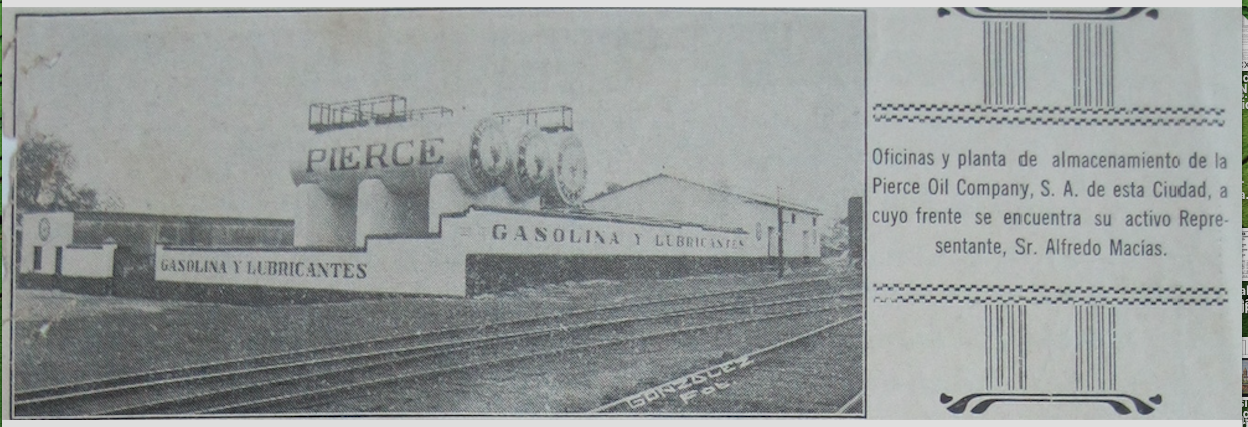 Por esos años la empresa transnacional Pierce Oil Company S.A. de Villa Cecilia estableció oficinas y planta de tres tanques de almacenamiento de gasolina y lubricantes en Ciudad Victoria, cerca de la estación del ferrocarril con la representación de Alfredo Macías en esta plaza. Vale mencionar que en 1930 la residencia particular -18 y 19 Matamoros- del señor Macías fue asaltada por “los amantes de lo ajeno.” El saqueo consistió en diversos artículos y obras artísticas de valor, lo mismo una gran cantidad de monedas de oro y plata que tenía guardadas en una caja fuerte. En 1932 el señor Felipe Romero, anunció a los victorenses la venta de grasas, aceites y cerveza en la Avenida Francisco I. Madero y Méndez.
