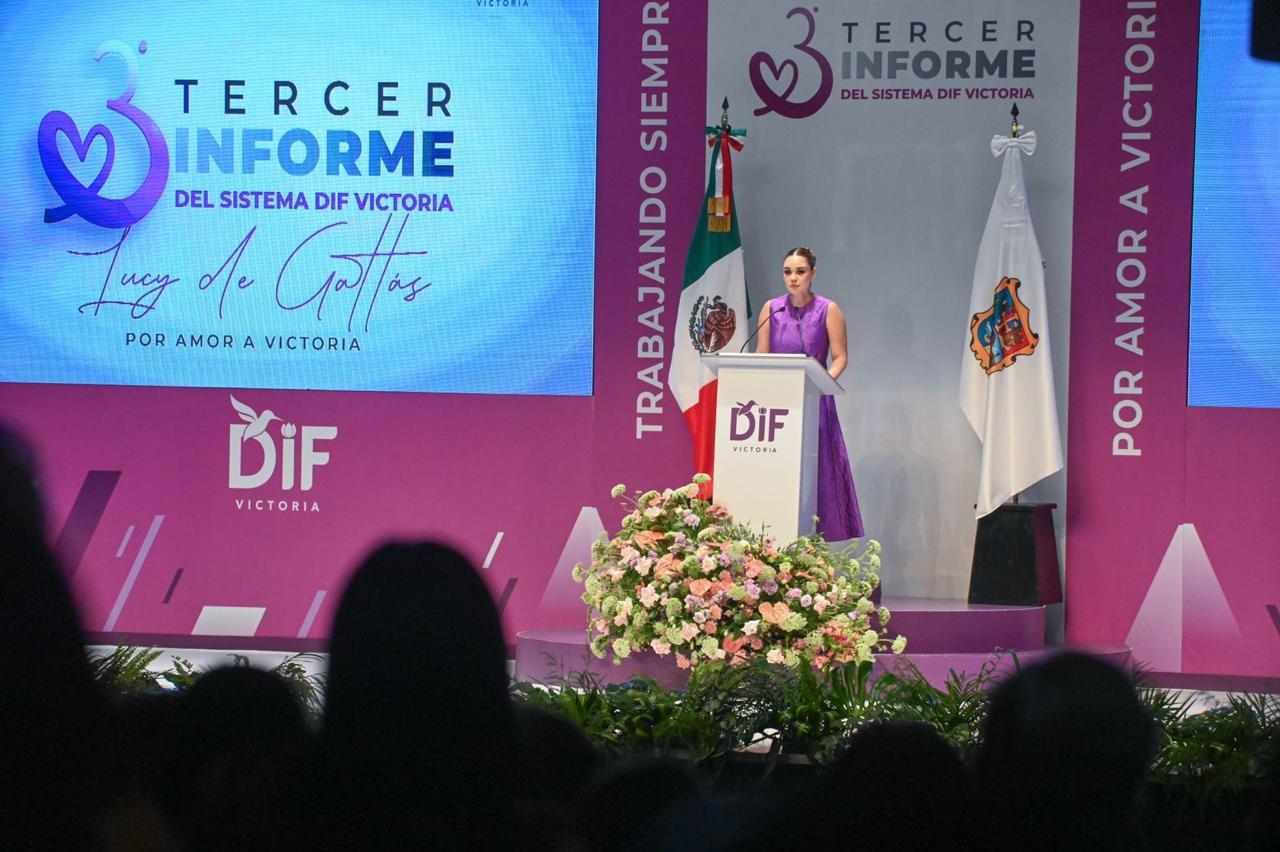 Con sueños hechos realidad y el compromiso de seguir transformando a Victoria de la mano de la sociedad por tres años más, la Presidenta del Sistema DIF Lucy Rodríguez de Gattás presentó su Tercer Informe de Actividades ante integrantes del patronato, voluntariado y familias victorenses.