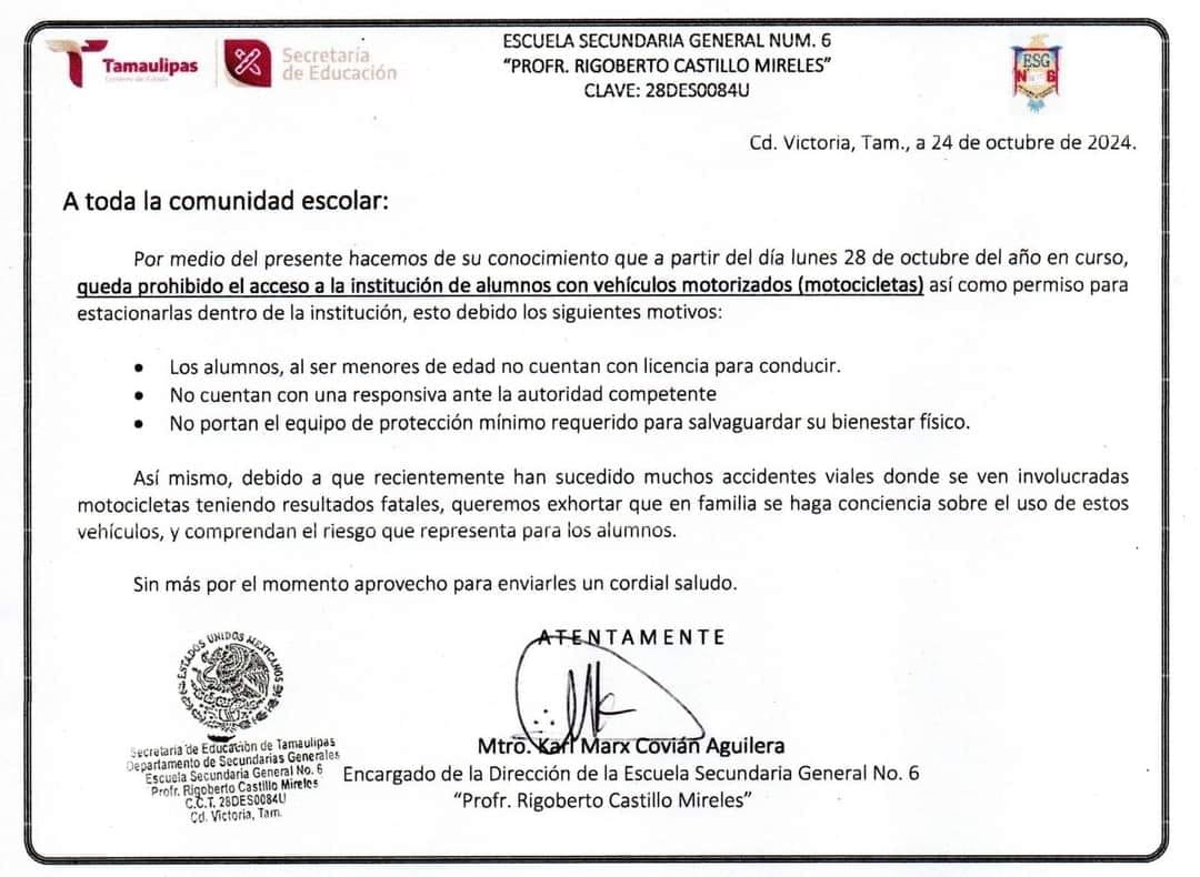 El encargado de la dirección de dicho plantel educativo, maestro Karl Marx Covián Aguilera, comunicó “A toda la comunidad escolar” lo siguiente; “por medio del presente hacemos de su conocimiento que a partir del día lunes 28 de octubre del año en curso queda prohibido el acceso a la institución de alumnos con vehículos motorizados (motocicletas) así como permiso para estacionarlas dentro de la institución, esto debido a los siguientes motivos: