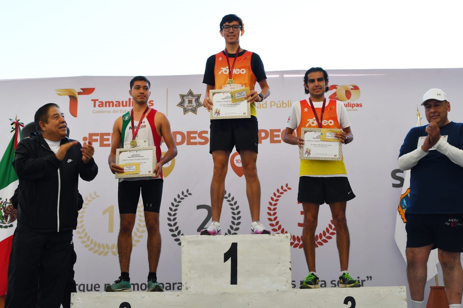 Una vez obtenidos los primeros lugares en la rama varonil y femenil de ambas distancias, el secretario de Seguridad Pública de Tamaulipas, Sergio Hernando Chávez García; el rector de la USJT, Willy Zúñiga Castillo; y el director del Consejo de Desarrollo Policial, Igor Mendoza Ruiz entregaron los reconocimientos y premios económicos a las y los ganadores.