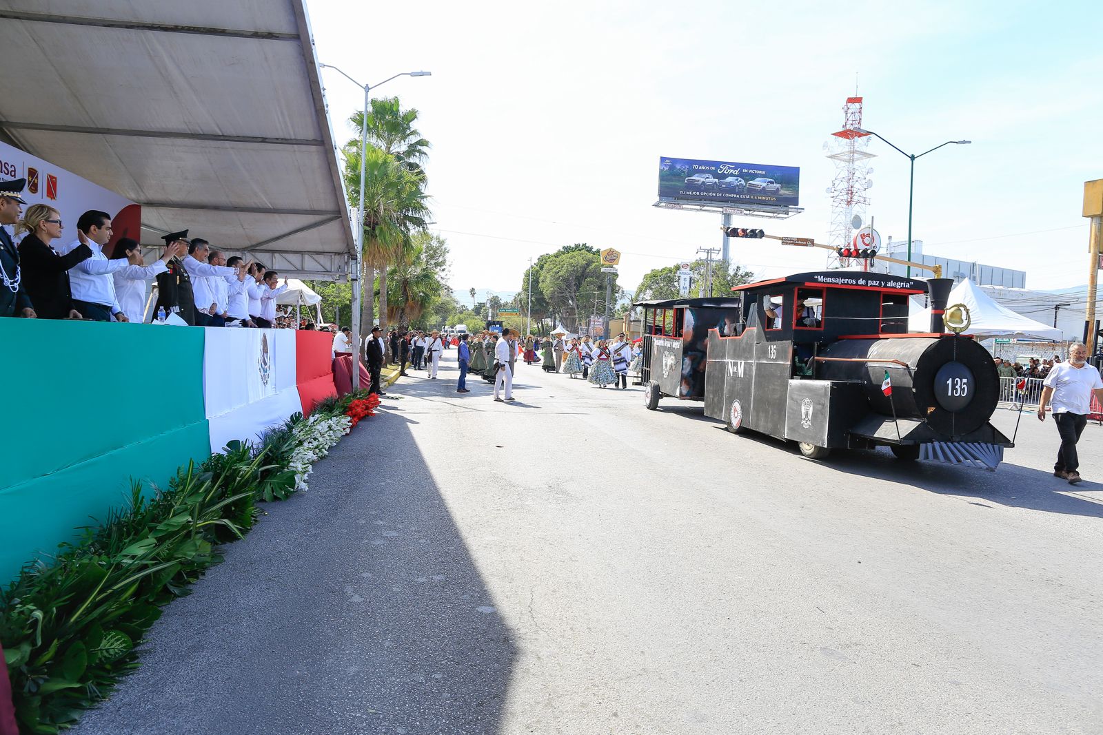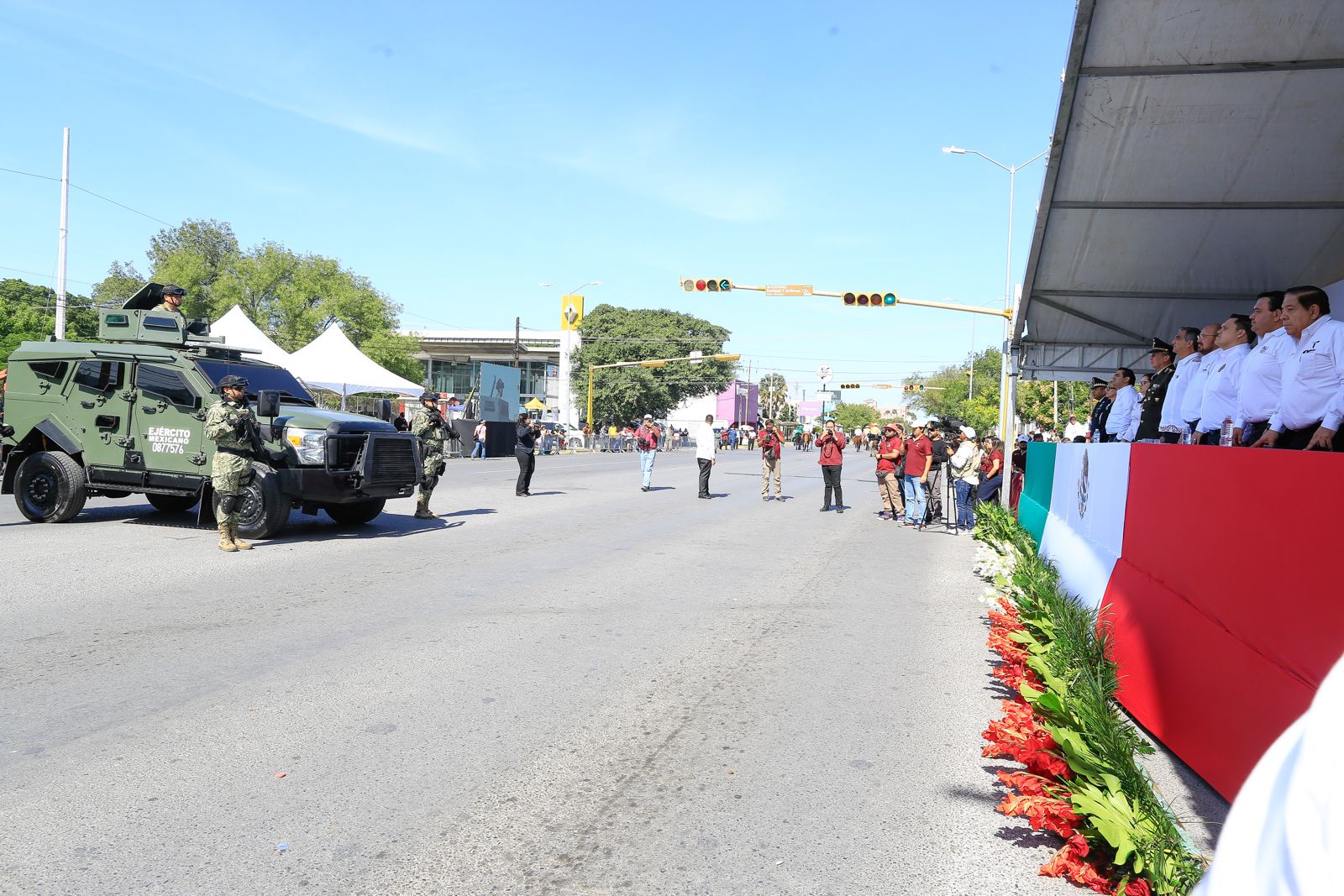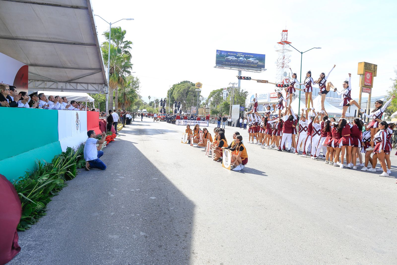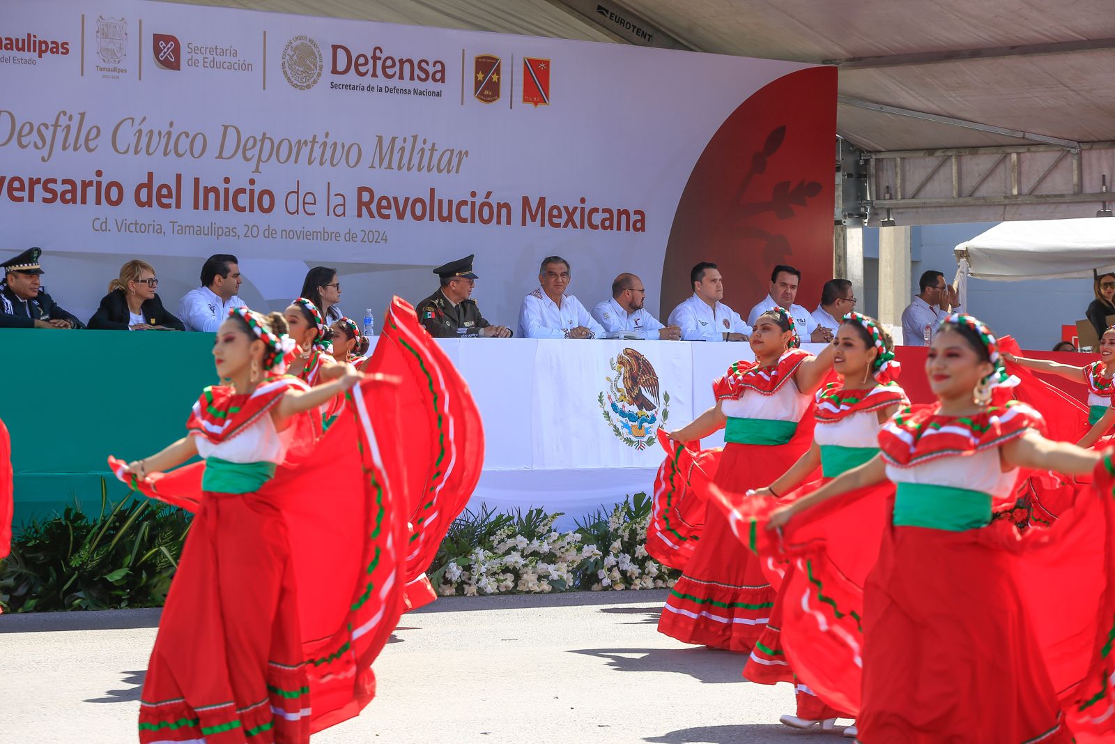 Acompañado por el general DEM Enrique García Jaramillo, comandante de la 48ª Zona Militar, el gobernador Américo Villarreal atestiguó, por espacio de casi cuatro horas, el paso de los contingentes llenos de colorido, música tradicional mexicana y atuendos revolucionarios, todos ejecutando sus rutinas, tablas gimnásticas, pirámides monumentales y evoluciones ante el aplauso de los miles de familias congregadas a lo largo del bulevar Tamaulipas.
