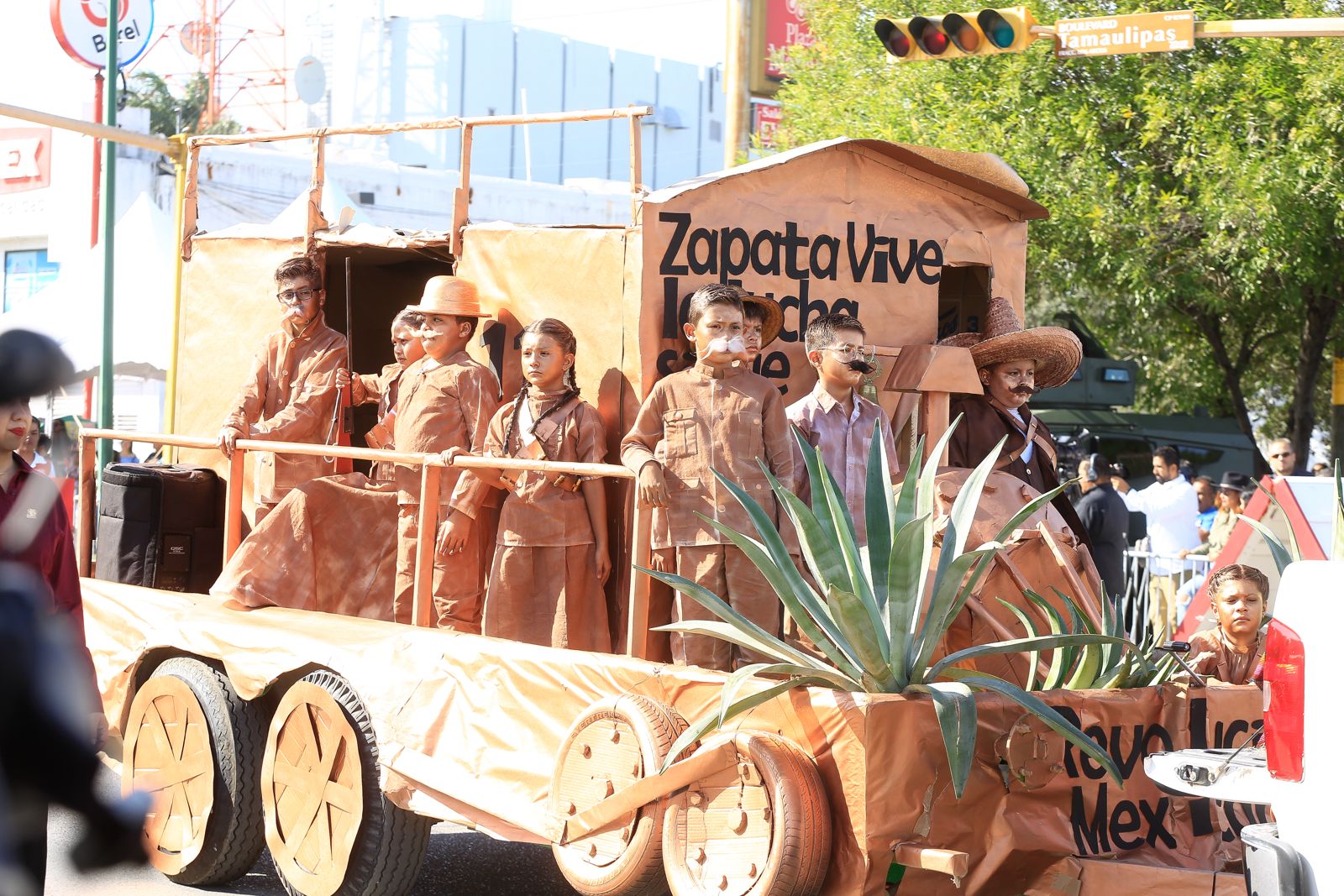 Acompañado por el general DEM Enrique García Jaramillo, comandante de la 48ª Zona Militar, el gobernador Américo Villarreal atestiguó, por espacio de casi cuatro horas, el paso de los contingentes llenos de colorido, música tradicional mexicana y atuendos revolucionarios, todos ejecutando sus rutinas, tablas gimnásticas, pirámides monumentales y evoluciones ante el aplauso de los miles de familias congregadas a lo largo del bulevar Tamaulipas.