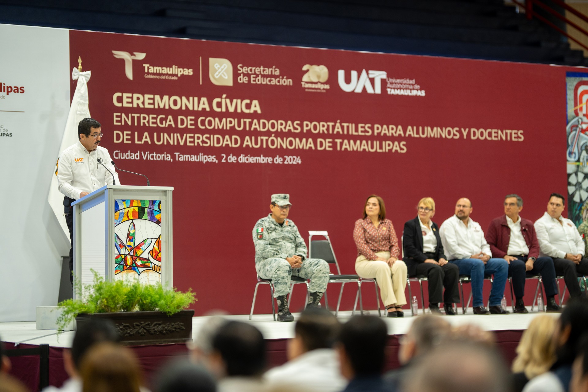 El evento contó con la presencia de secretarios del Gobierno de Tamaulipas, representantes de los Poderes Legislativo y Judicial, autoridades militares, funcionarios de la Rectoría, docentes y estudiantes de la UAT.
