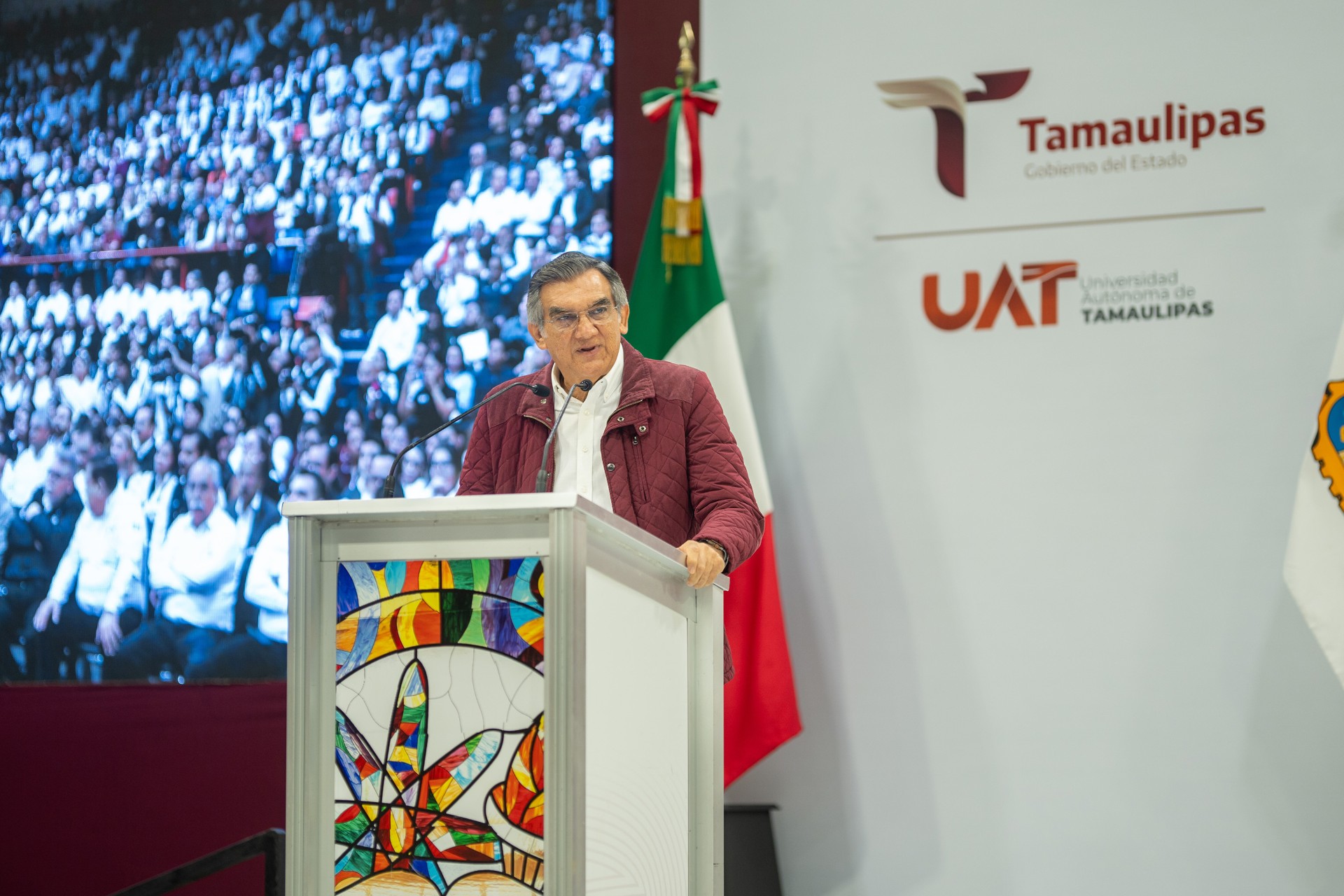 El gobernador encabezó la ceremonia cívica de honores a la bandera en el Gimnasio Multidisciplinario de la UAT, donde destacó la relevancia de este acto en el que, por primera vez, se hace entrega a los universitarios de este importante recurso para apoyar la labor docente y el esfuerzo de sus estudiantes para formarse con las mejores herramientas.