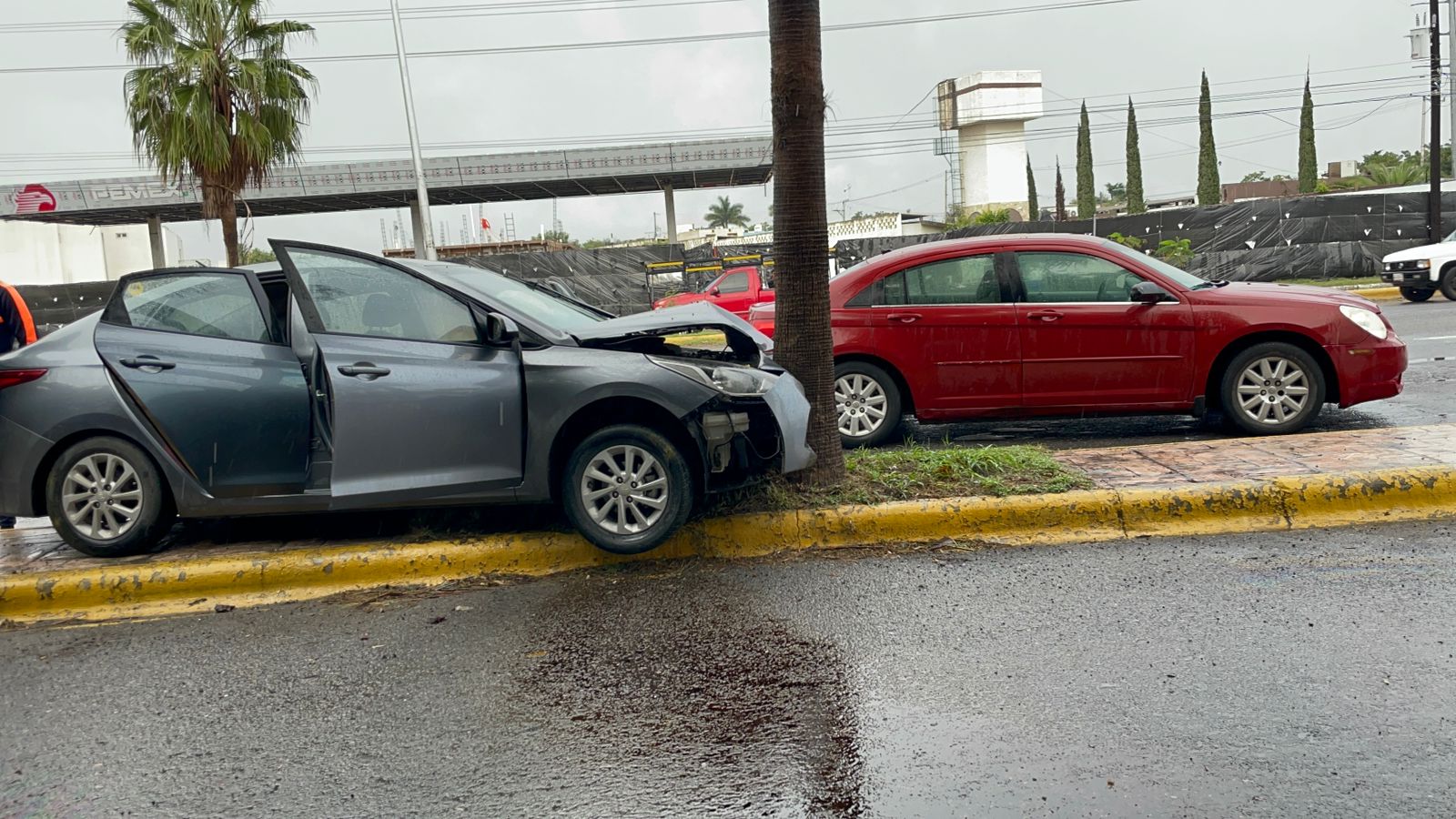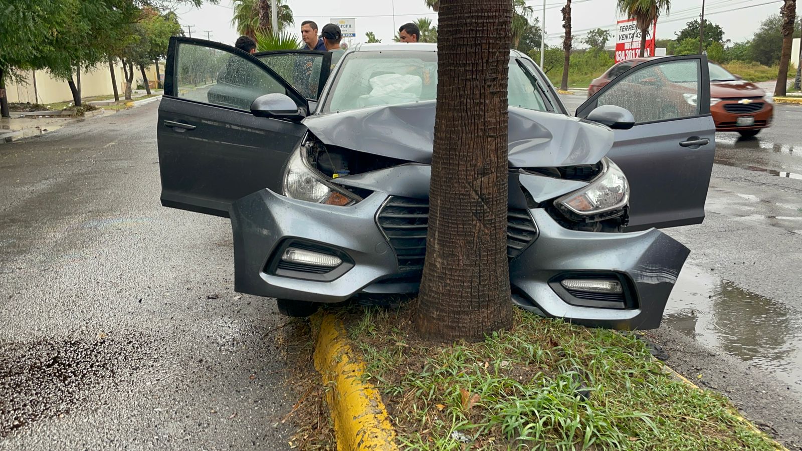 Después de desviar su trayectoria hacia su lado derecho a la altura de la Calle Artículo 32, el automóvil Mazda3 terminó por estrellarse de manera frontal contra una palmera en el divisor de carriles.