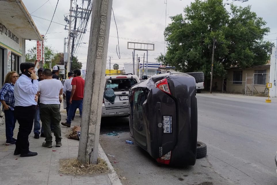 Fue en el Uno y Dos Alberto Carrera Torres, afuera de una forrajera, el lugar en donde quedó volcado sobre uno de sus costados un automóvil Nissan Versa con placas de Tamaulipas.
