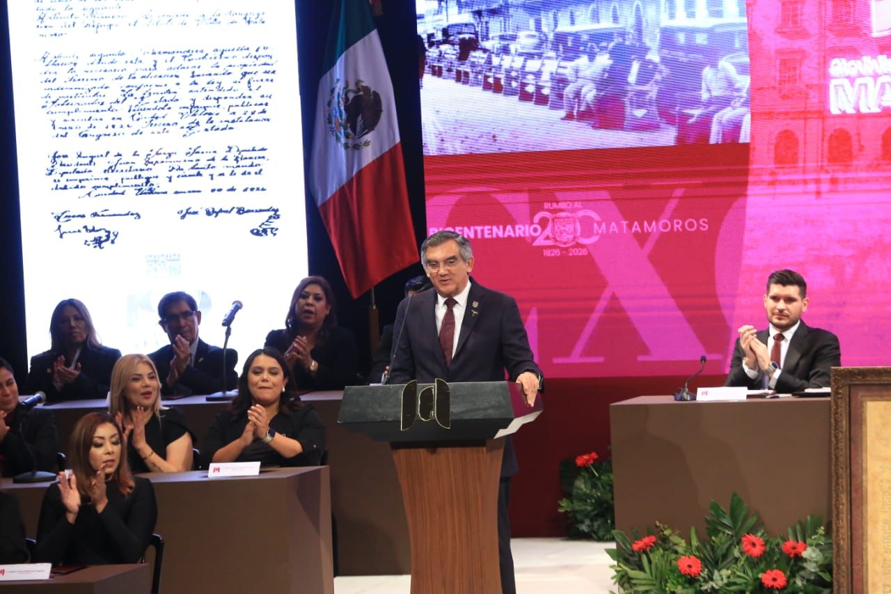 Durante la sesión solemne del cabildo matamorense, encabezada por el alcalde José Alberto Granados Favila, en el Teatro Reforma, el gobernador destacó la importancia y grandeza de Matamoros y su sociedad que a lo largo de dos siglos ha sido verdaderamente heroica.