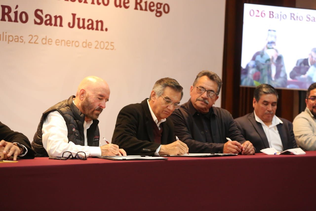 Como parte del Plan Nacional Hídrico que impulsa la presidenta Claudia Sheinbaum, el gobernador Américo Villarreal Anaya firmó un convenio de colaboración entre la Comisión Nacional del Agua (CONAGUA), el Estado a través de la Secretaría de Recursos Hidráulicos de Tamaulipas, la Secretaría de Agricultura y Desarrollo Rural y los usuarios del Distrito de Riego 026 Bajo Río San Juan