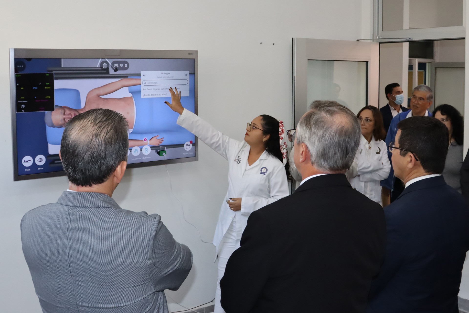 Se mostró el chaleco de exploración mamaria, que permite identificar patologías mediante técnicas de palpación, y la plataforma interactiva Body Interact, que permite evaluar pacientes virtuales en escenarios clínicos controlados, facilitando la toma de decisiones médicas y el desarrollo de habilidades diagnósticas.