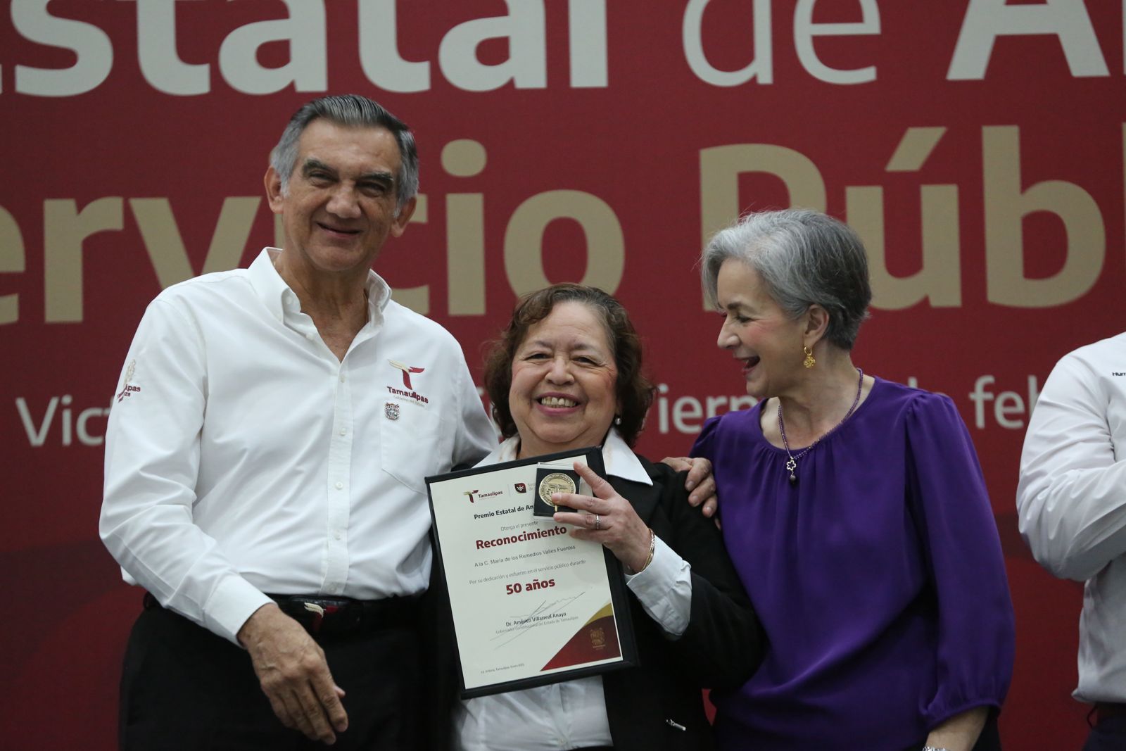 Luego del efusivo recibimiento y los gritos de ¡gobernador!, ¡gobernador! por parte de los asistentes, Américo Villarreal entregó los premios de antigüedad, incluyendo a cuatro trabajadores y trabajadores con 50 años de servicio: María de los Remedios Valles Fuentes (Secretaría de Finanzas); Ramiro Huerta Rodríguez (Secretaría de Obras Públicas); Marco Antonio Valdez Juárez (Secretaría de Administración) y Blanca Guadalupe Valles Rodríguez (Secretaría de Administración).