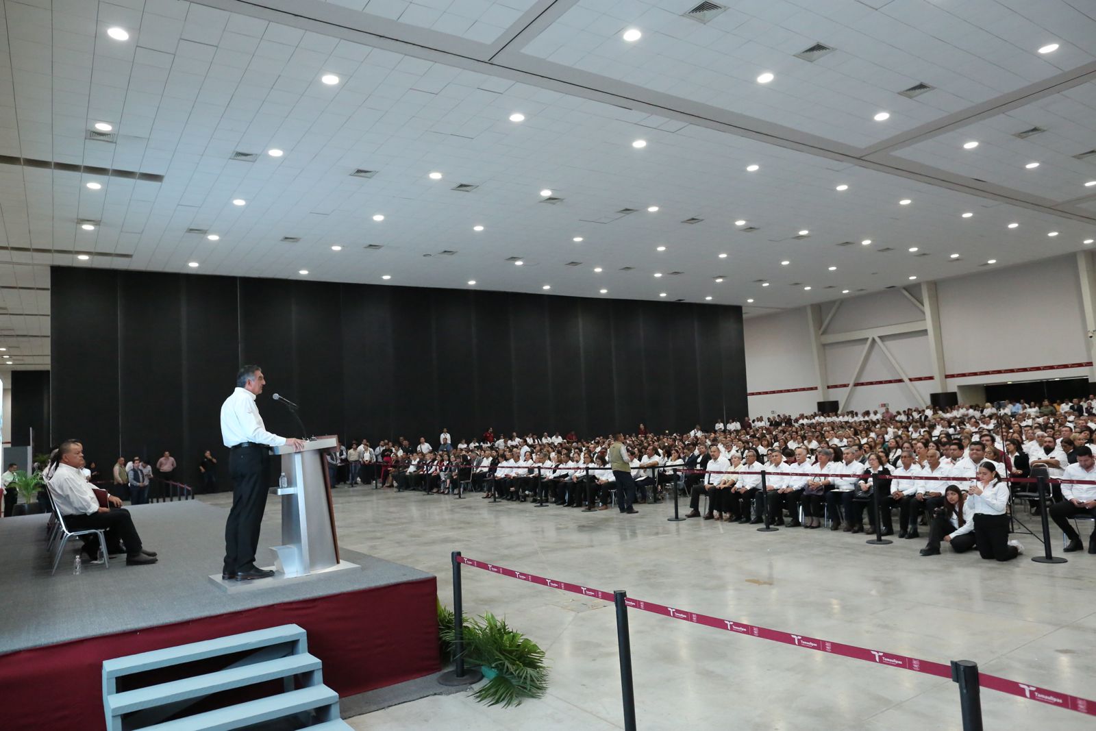 Durante la ceremonia celebrada en el polyforum, el gobernador, acompañado por la presidenta del DIF Tamaulipas, doctora María de Villarreal y los titulares de los Poderes Legislativo y Judicial, destacó la aportación y el trabajo diario que realizan las y los burócratas para contribuir con su esfuerzo constante para la transformación en la entidad.