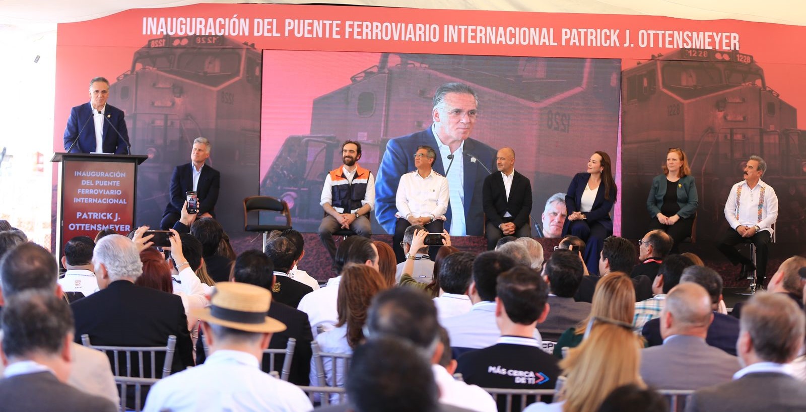 El gobernador Américo Villarreal Anaya y el secretario de Infraestructura, Comunicaciones y Transportes, Jesús Antonio Esteva Medina, junto con directivos de la empresa Canadian Pacific Kansas City, inauguraron en esta ciudad el puente ferroviario internacional Patrick J. Ottensmeyer, que permitirá duplicar el intercambio comercial entre el corazón industrial de México con Estados Unidos y Canadá.