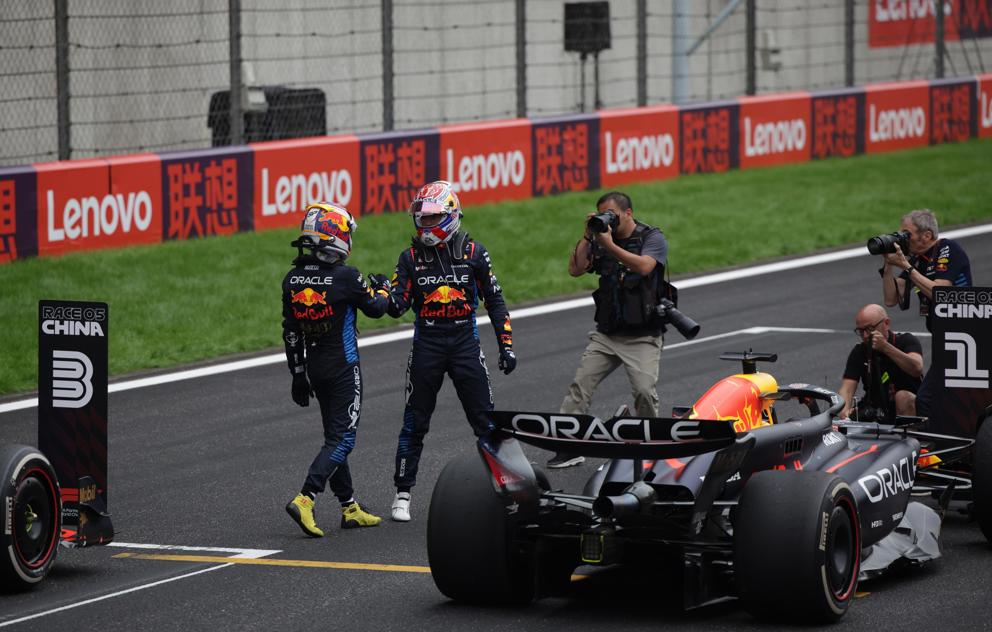Shanghai (China), 21/04/2024.- First placedd Red Bull Racing driver Max Verstappen of the Netherlands (2-L) and third place Red Bull Racing driver Sergio Perez of Mexico (L) shake hands winning the Formula One Chinese Grand Prix, in Shanghai, China, 21 April 2024. The 2024 Formula 1 Chinese Grand Prix is held at the Shanghai International Circuit racetrack on 21 April after a five-year hiatus. (Fórmula Uno, Países Bajos; Holanda) EFE/EPA/ANDRES MARTINEZ CASARES