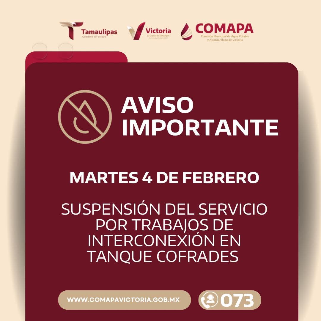 CD. VICTORIA, TAMAULIPAS. – Mañana martes cuatro de febrero, la empresa que se encuentra construyendo el nuevo tanque de almacenamiento en Cofrades, estará realizando trabajos de interconexión entre el nuevo tanque y el ya existente; por tal motivo el servicio se suspenderá durante dichos trabajos a las siguientes colonias y/o fraccionamientos: