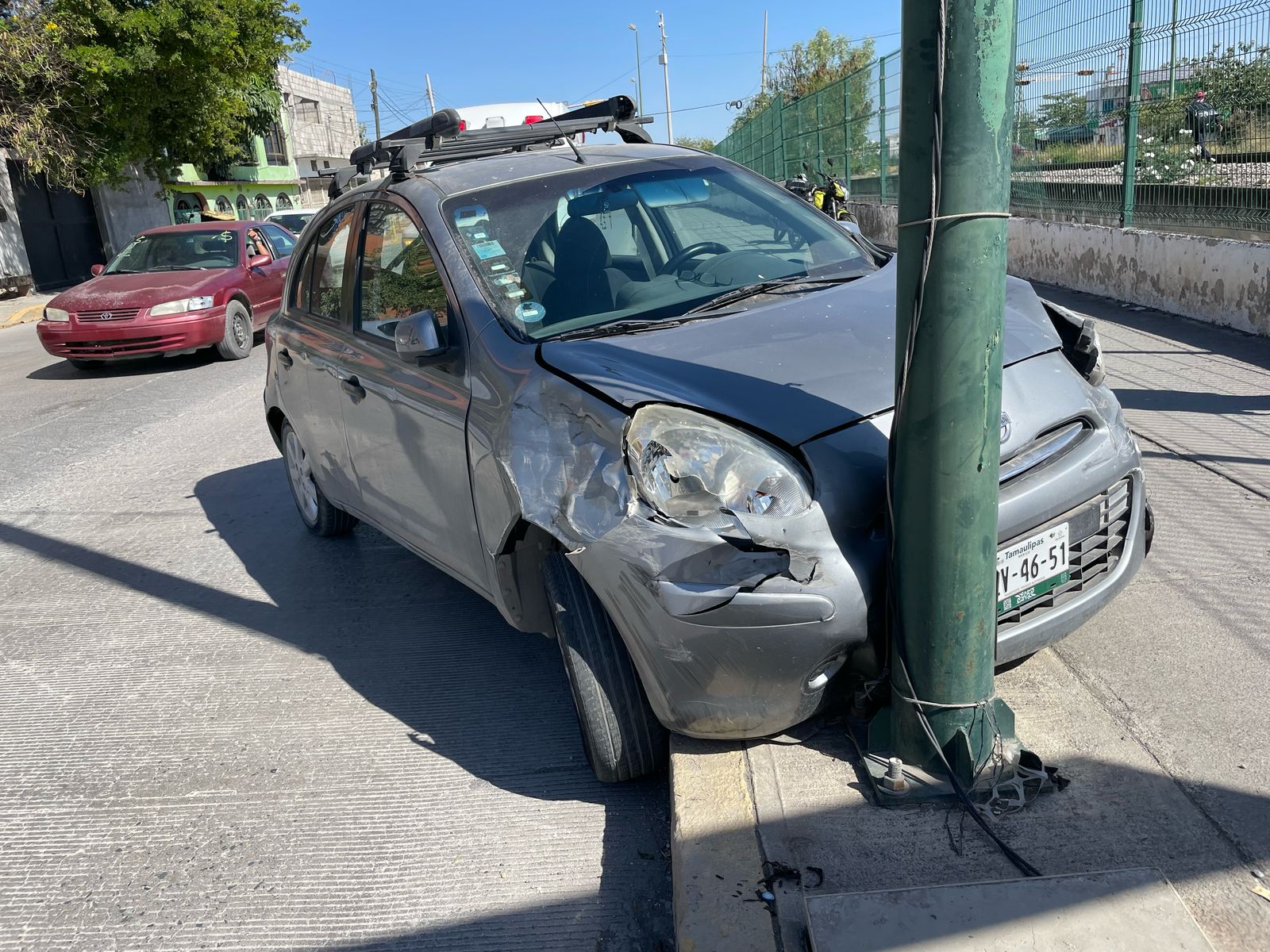 Finalmente, a la altura de la calle artículo 27 de la colonia Lázaro Cárdenas, el automóvil March detuvo su marcha al estrellarse de manera frontal contra un poste de metálico de alumbrado público.