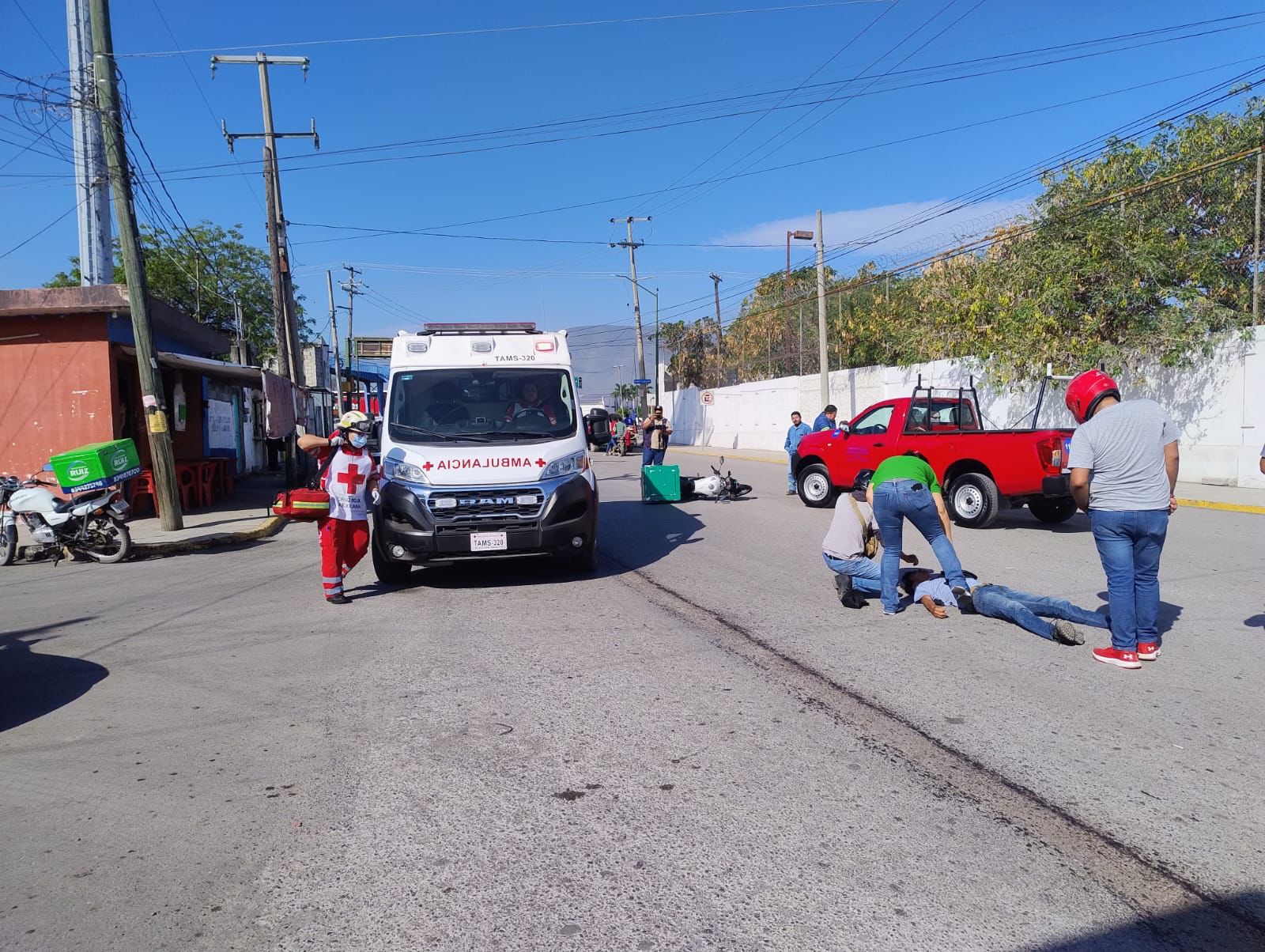 Un motociclista, repartidor de la Refaccionaria Ruiz que circulaba sin la debida protección que estipula el reglamento vial, resultó lesionado esta mañana luego de chocar contra una camioneta tipo pick-up.