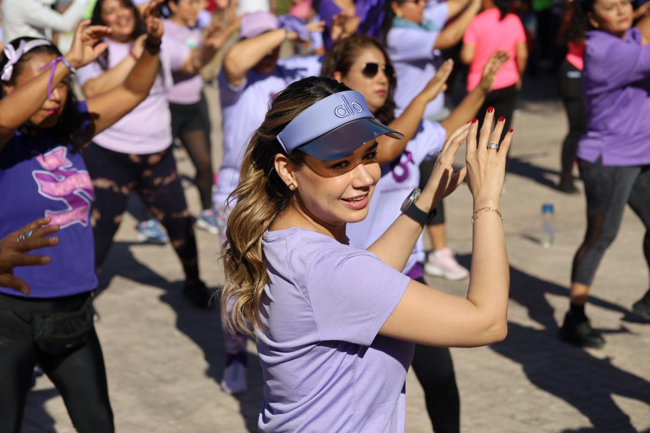La actividad con causa, organizada por el Departamento de Deportes del Municipio, se llevó a cabo en la explanada del Paseo Méndez, con la participación de instructores y grupos de zumba portando la playera alusiva con la frase impresa “Juntas Somos Más Fuertes”.