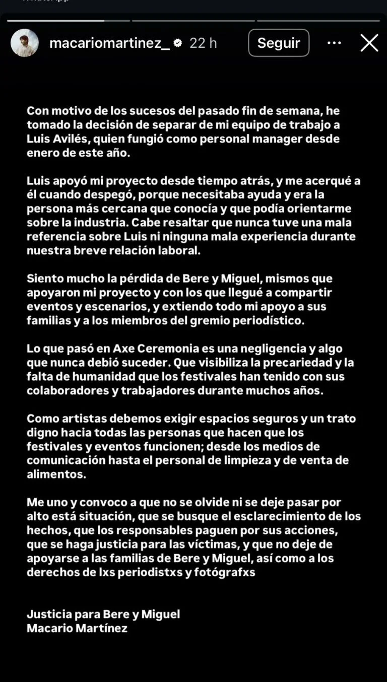 El músico Macario Martínez anunció que ha decidido romper su relación laboral con su mánager, Luis Avilés, quien también se desempeñaba como encargado de prensa en el festival Axe Ceremonia. La decisión surge tras el fallecimiento de los fotógrafos Berenice Giles y Miguel Hernández durante el evento, ocurrido el sábado pasado.