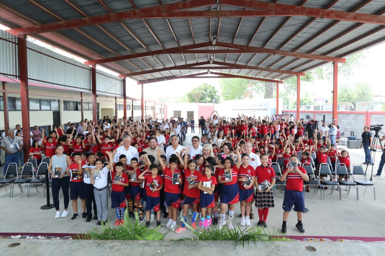 Cd. Victoria, Tamaulipas. – Al poner en marcha la primera Semana Nacional de Vacunación en escuelas de educación básica y tras cumplir un compromiso que hizo hace pocas semanas de entregar dispositivos informáticos móviles a estudiantes de la escuela primaria “Felipe Pescador”, el gobernador Américo Villarreal Anaya aseguró que las niñas y los niños son la felicidad presente de Tamaulipas y la felicidad de una nueva sociedad que busca un futuro de bienestar con una visión humanista.