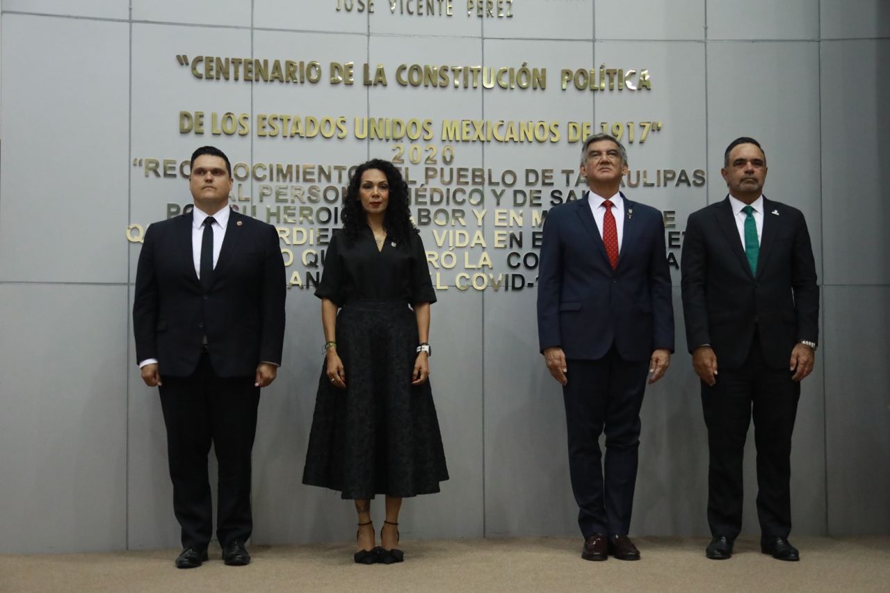 Al concluir la Sesión Solemne, los titulares de los tres poderes del Estado y la Presidenta de la Mesa Directiva del Congreso de Tamaulipas, Diputada Cynthia Lizabeth Jaime Castillo, realizaron una guardia en el “Muro de Honor de los Constituyentes Tamaulipecos”, en el Recinto Legislativo.