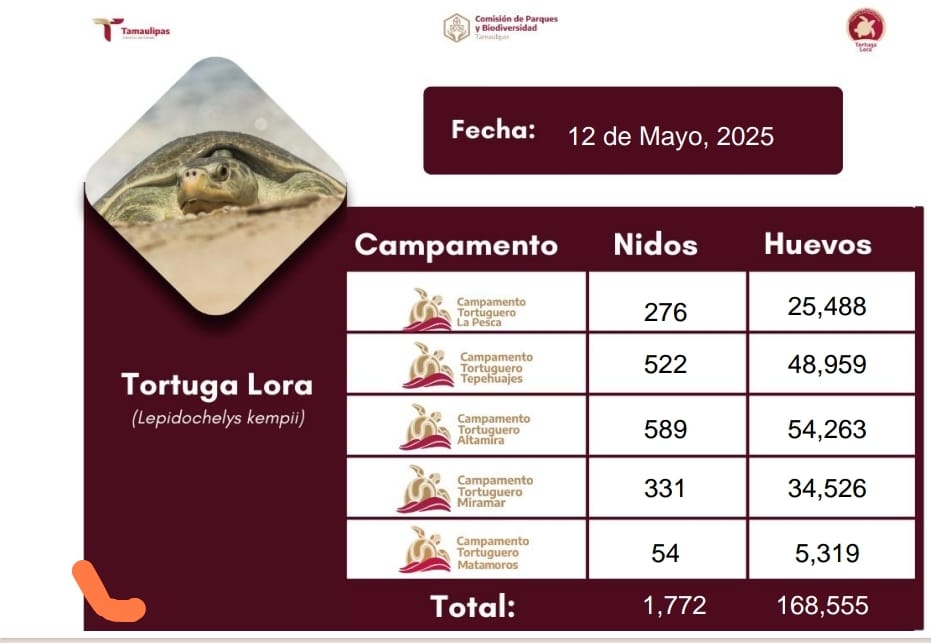 Ciudad Victoria, Tamaulipas.- Con un incremento del 20% en el número de huevos protegidos en comparación con 2024, la Comisión de Parques y Biodiversidad del Estado reporta un arranque positivo en la temporada de anidación de la tortuga lora, que este año ha superado ya los 1 mil 772 nidos y 168 mil 555 huevos resguardados en los campamentos de La Pesca, Tepehuajes, Altamira, Miramar y Matamoros.