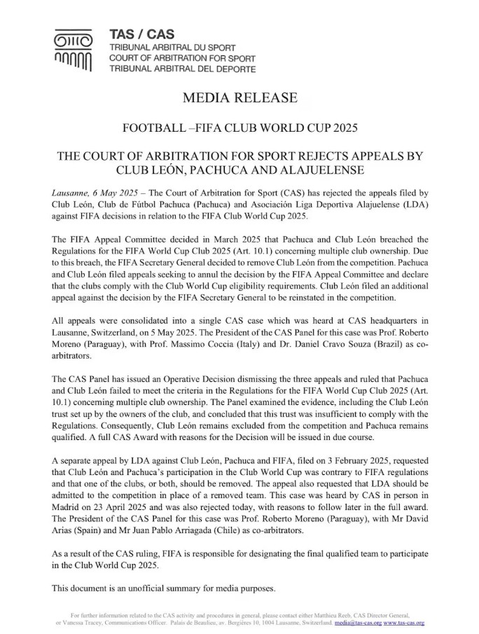 La resolución fue comunicada la mañana de este martes 6 de mayo desde Lausana, Suiza, sede del TAS, poniendo fin al proceso de apelación iniciado por León luego de que la FIFA lo excluyera del certamen por el tema de multipropiedad.