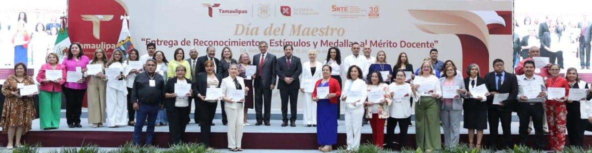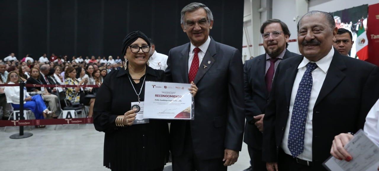 Por la mañana, en el Centro Regional de Formación Docente e Investigación Educativa (CRETAM), Villarreal Anaya presidió la ceremonia de ingreso a la Galería de Honor del Magisterio Tamaulipeco, y entregó reconocimiento y la medalla Lauro Aguirre a la galardonada de Educación Básica, doctora María de Jesús Lara Tijerina, y a la doctora Lucila Olvera Flores, galardonada de Educación Media Superior y Superior.