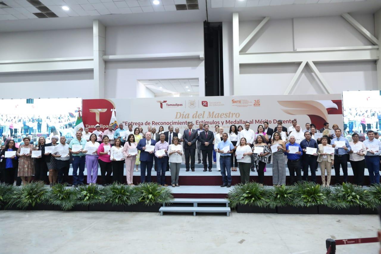 Por la mañana, en el Centro Regional de Formación Docente e Investigación Educativa (CRETAM), Villarreal Anaya presidió la ceremonia de ingreso a la Galería de Honor del Magisterio Tamaulipeco, y entregó reconocimiento y la medalla Lauro Aguirre a la galardonada de Educación Básica, doctora María de Jesús Lara Tijerina, y a la doctora Lucila Olvera Flores, galardonada de Educación Media Superior y Superior.