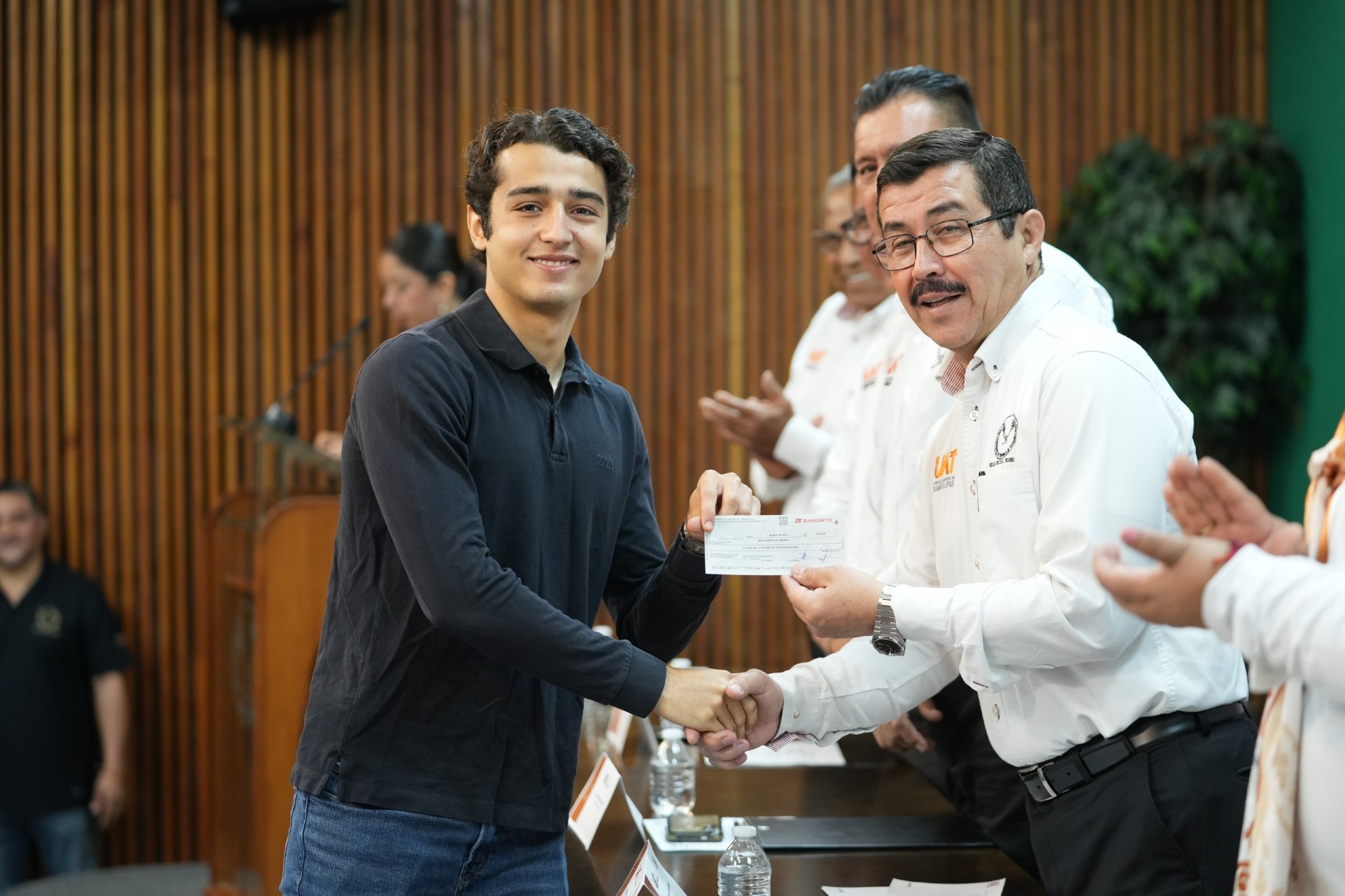 El rector Dámaso Anaya Alvarado presidió la ceremonia de entrega de estímulos económicos a hijas e hijos del personal docente que se han destacado como estudiantes de excelencia en la Universidad Autónoma de Tamaulipas, así como la firma del contrato colectivo laboral 2025 con el Sindicato Único de Trabajadores Académicos de la UAT (SUTAUAT).
