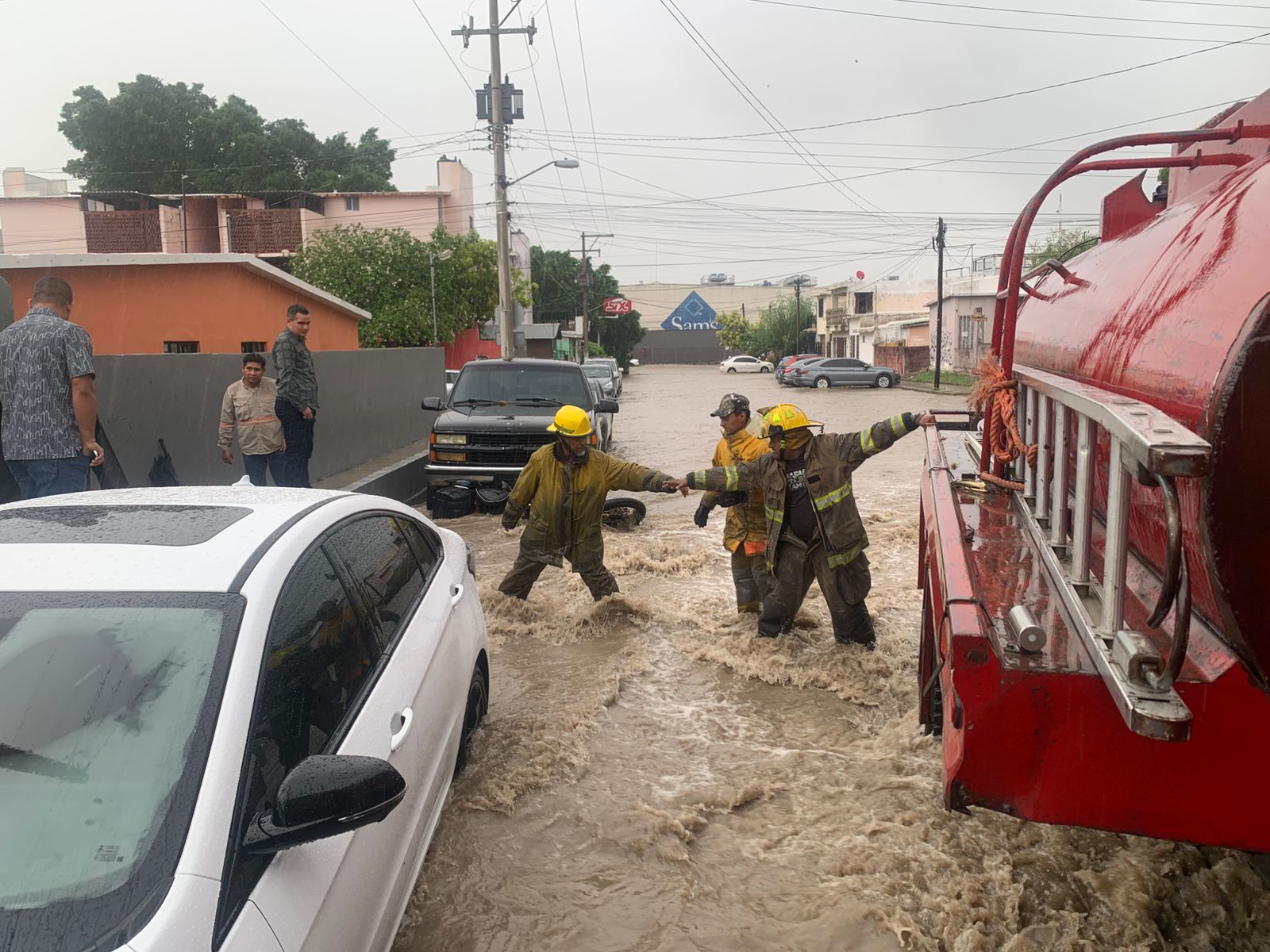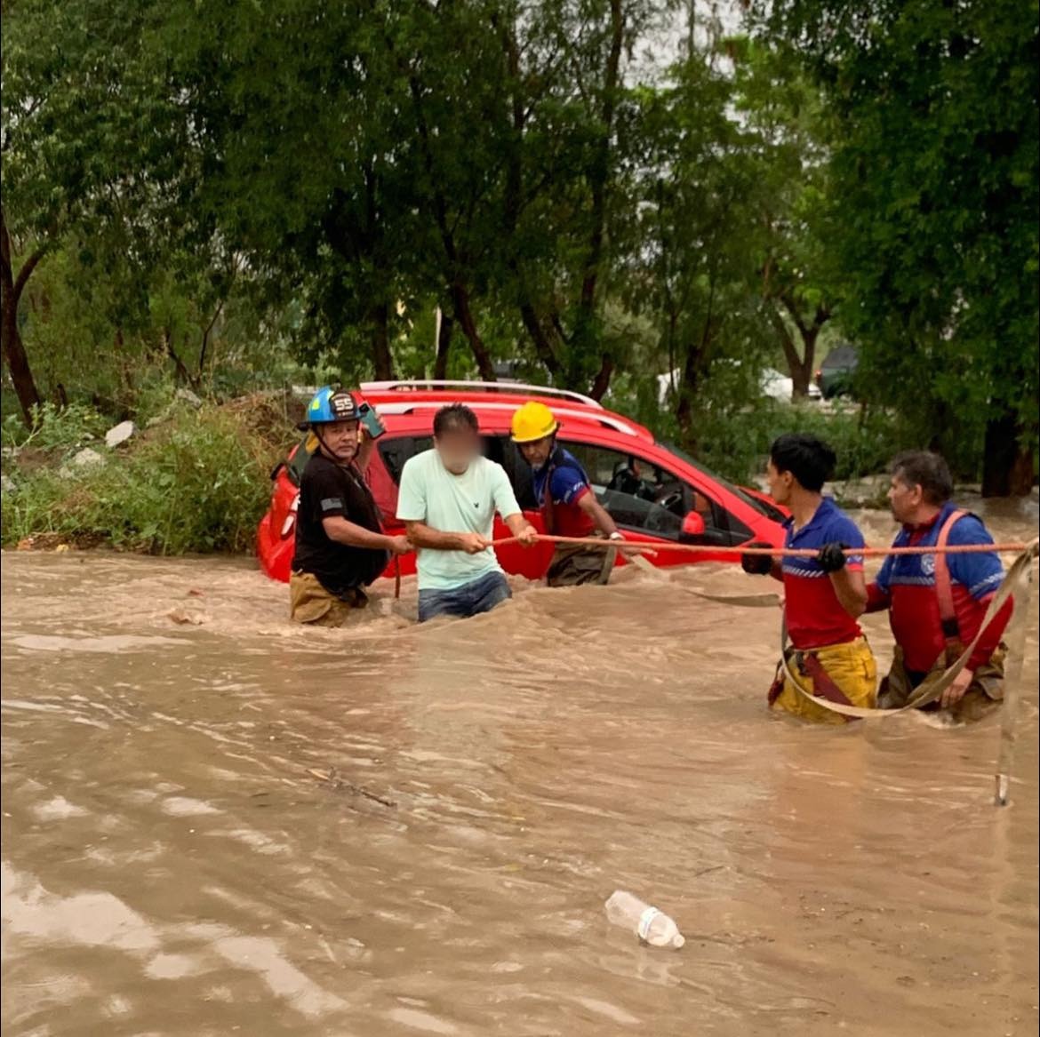 En respuesta a un llamado realizado al número de emergencias 911, elementos del Cuerpo de Bomberos acudieron al crucero del Eje Vial Lázaro Cárdenas y Juan José de la Garza, donde una familia también quedó atrapada en su vehículo entre un severo encharcamiento.