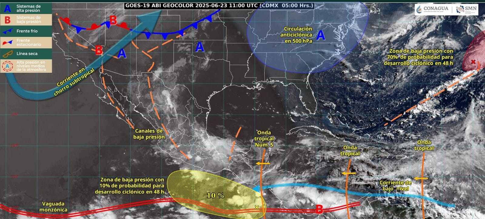 Señaló que debido a canales de baja presión en combinación con inestabilidad atmosférica y el ingreso de humedad de ambos océanos, además de la proximidad de la vaguada monzónica y de la onda tropical número cinco, asociada con una zona de baja presión con probabilidad para desarrollo ciclónico al sur de El Salvador; originarán chubascos y lluvias fuertes a muy fuertes sobre la Mesa del Norte, el occidente, centro, noreste, oriente, sur y sureste del territorio nacional, incluida la península de Yucatán.