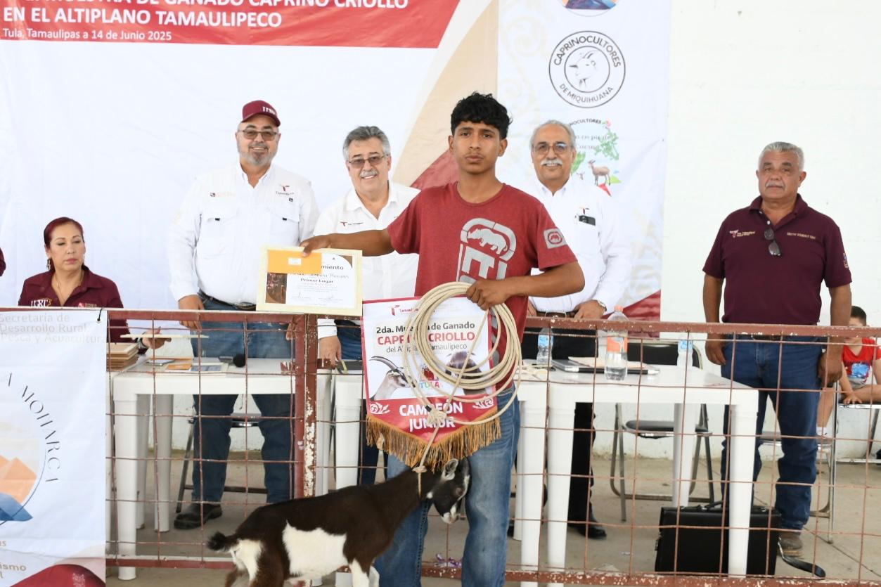 Tula, Tamaulipas. – Con el fin de impulsar el desarrollo rural sostenible y la competitividad del sector caprino, la Secretaría de Desarrollo Rural, Pesca y Acuacultura, a través de la Dirección de Extensionismo Pecuario y Forestal, en colaboración con el municipio de Tula, llevó a cabo con éxito la Segunda Muestra Regional de Ganado Caprino Criollo del Altiplano Tamaulipeco.