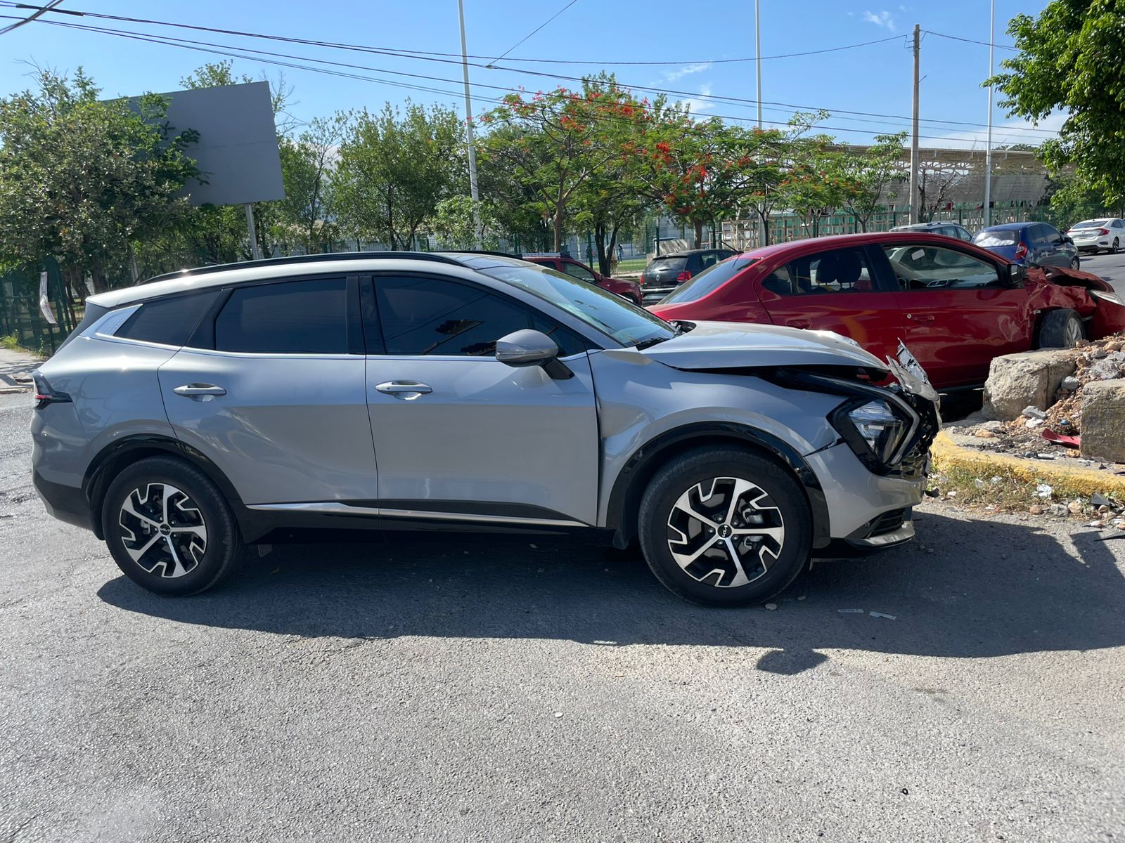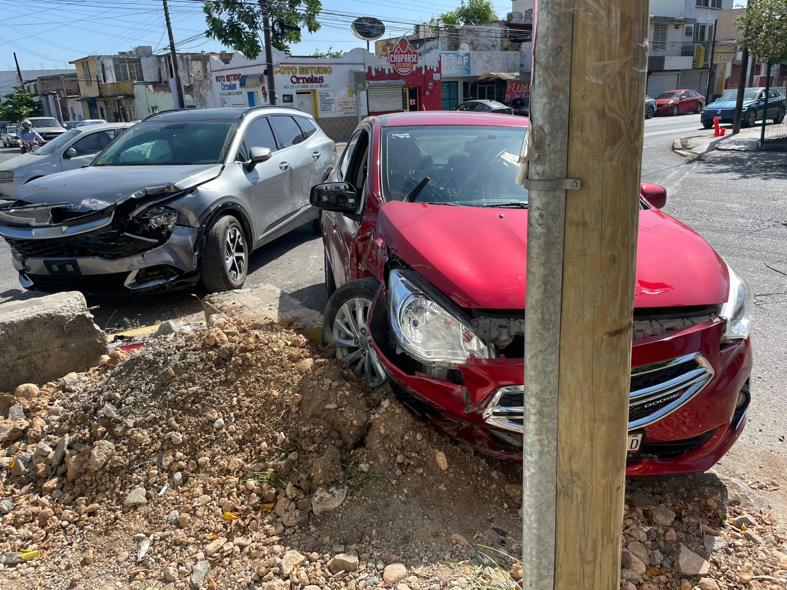 Tras el encontronazo, ambos vehículos desviaron su trayectoria hacia su lado izquierdo, y el automóvil Attitude terminó embancado en un montículo de tierra, y a un costado la camioneta Kia.