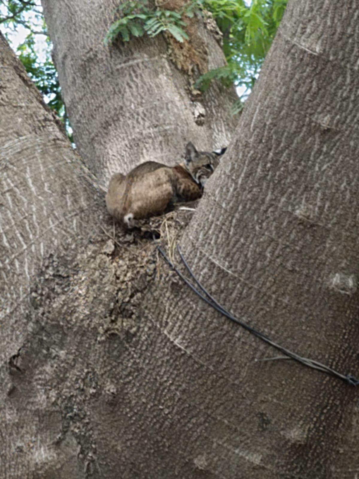 Ciudad Victoria, Tamaulipas (11 de junio de 2025).- Este miércoles, personal del Zoológico de Tamatán y elementos del Cuerpo de Bomberos llevaron a cabo un operativo para rescatar a un gato montés que fue ubicado en la colonia Azteca Segunda Etapa.