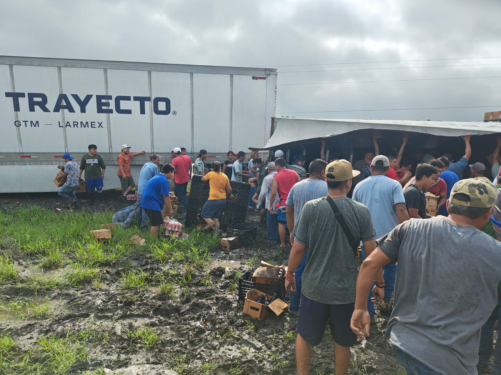 Fue aproximadamente a dos kilómetros del Ejido Plan de Ayala donde el primer remolque de un tractocamión de la marca Keenworth que venía de Monterrey hacia esta Ciudad quedó volcado y en su alrededor una gran cantidad de cerveza tirada.