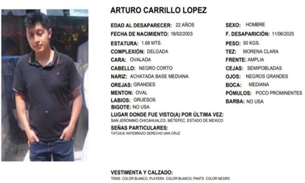 Así fue cuando se perdió el contacto con él, de acuerdo con el boletín de búsqueda Arturo Carrillo es un joven que mide 1.68 metros, de complexión delgada, su cabello es negro y corto, nariz achatada de base mediana, orejas grandes y labios gruesos.