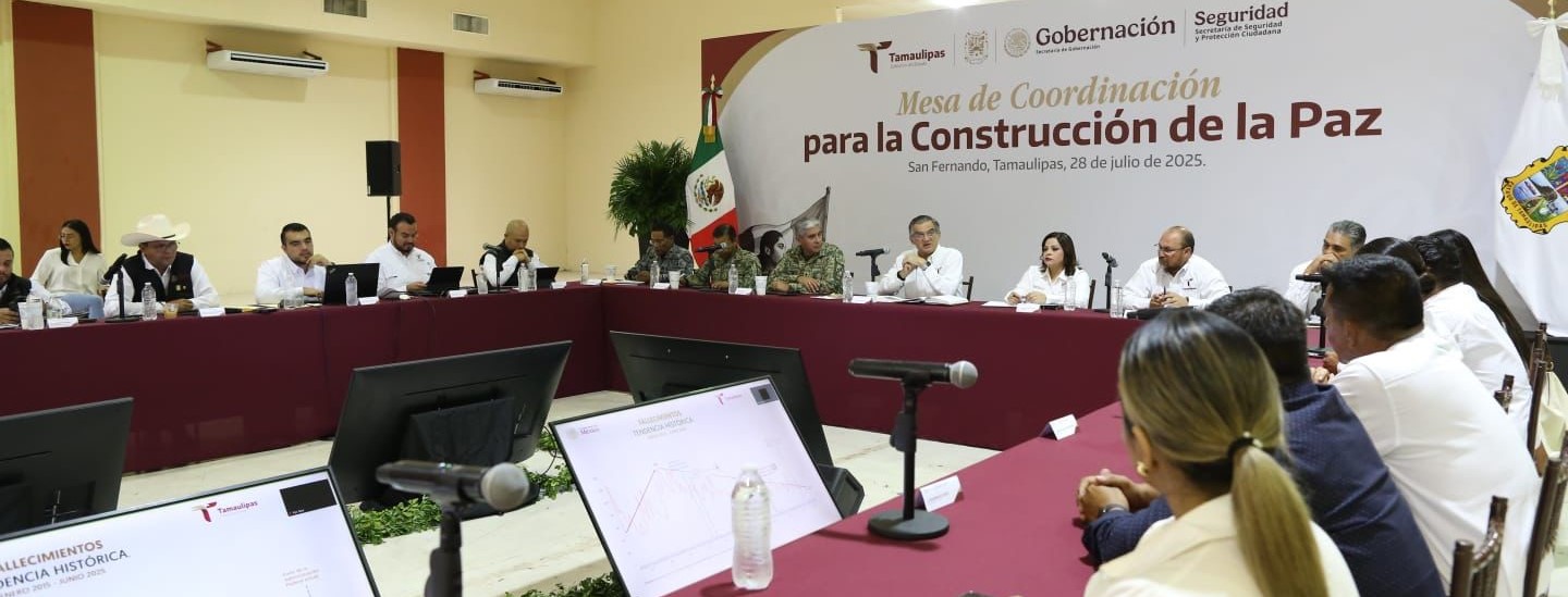 Acompañado por el secretario de Seguridad Pública, Carlos Pancardo Escudero, y la presidenta municipal de San Fernando, Verónica Aguirre de los Santos, así como por las y los alcaldes de Soto la Marina, Jiménez, Burgos, Méndez, Abasolo y San Nicolás, el gobernador presidió en el Centro de Convenciones la Mesa de Coordinación para la Construcción de Paz.