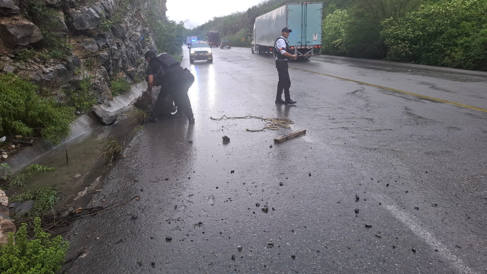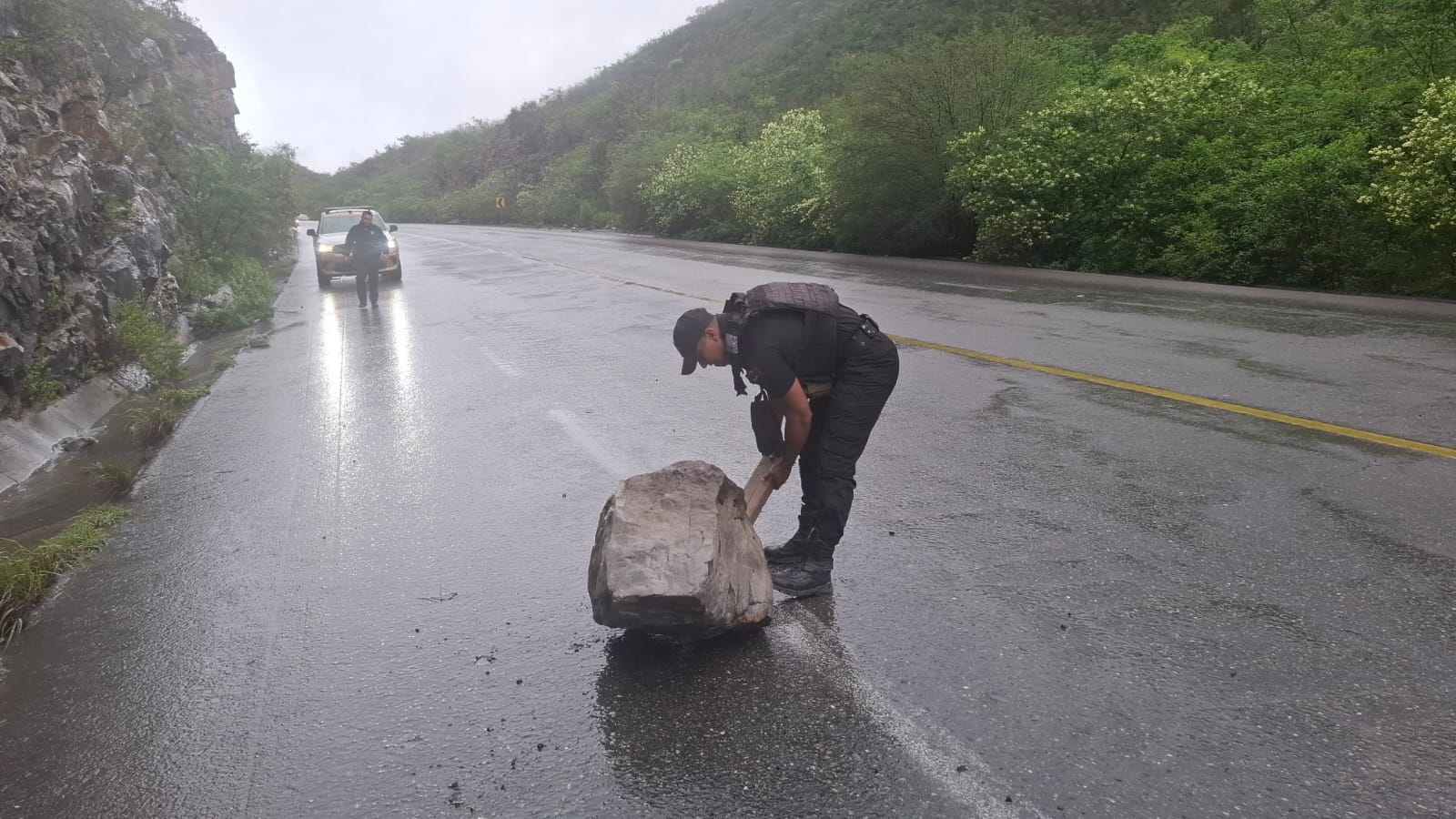 En un patrullaje sobre la Carretera Estatal 126 Rumbo Nuevo” (Victoria-Jaumave) en la ruta Victoria-San Luis Potosí, elementos comisionados a la Estación Segura Jaumave visualizaron piedras caídas por deslave desde la sierra sobre el kilómetro 28 cerca del “Túnel Falso”.