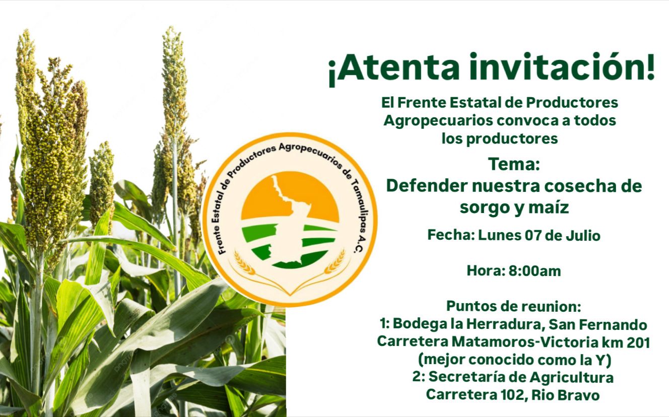San Fernando, Tamaulipas. – Productores Agrícolas del Norte de Tamaulipas lanzaron un último grito de auxilio al gobierno federal, dirigido a los secretarios de Agricultura Julio Berdegué Sacristán, al de Hacienda Edgar Amador Zamora y de Gobernación Rosa Icela Rodríguez para que den una respuesta urgente a la emergencia de quienes siembran 510 mil hectáreas de sorgo y 37 mil de maíz, que, por efectos de sequía, desplome dramático de precios y exceso de lluvia en la recolección de cosechas están damnificados y quebrados.