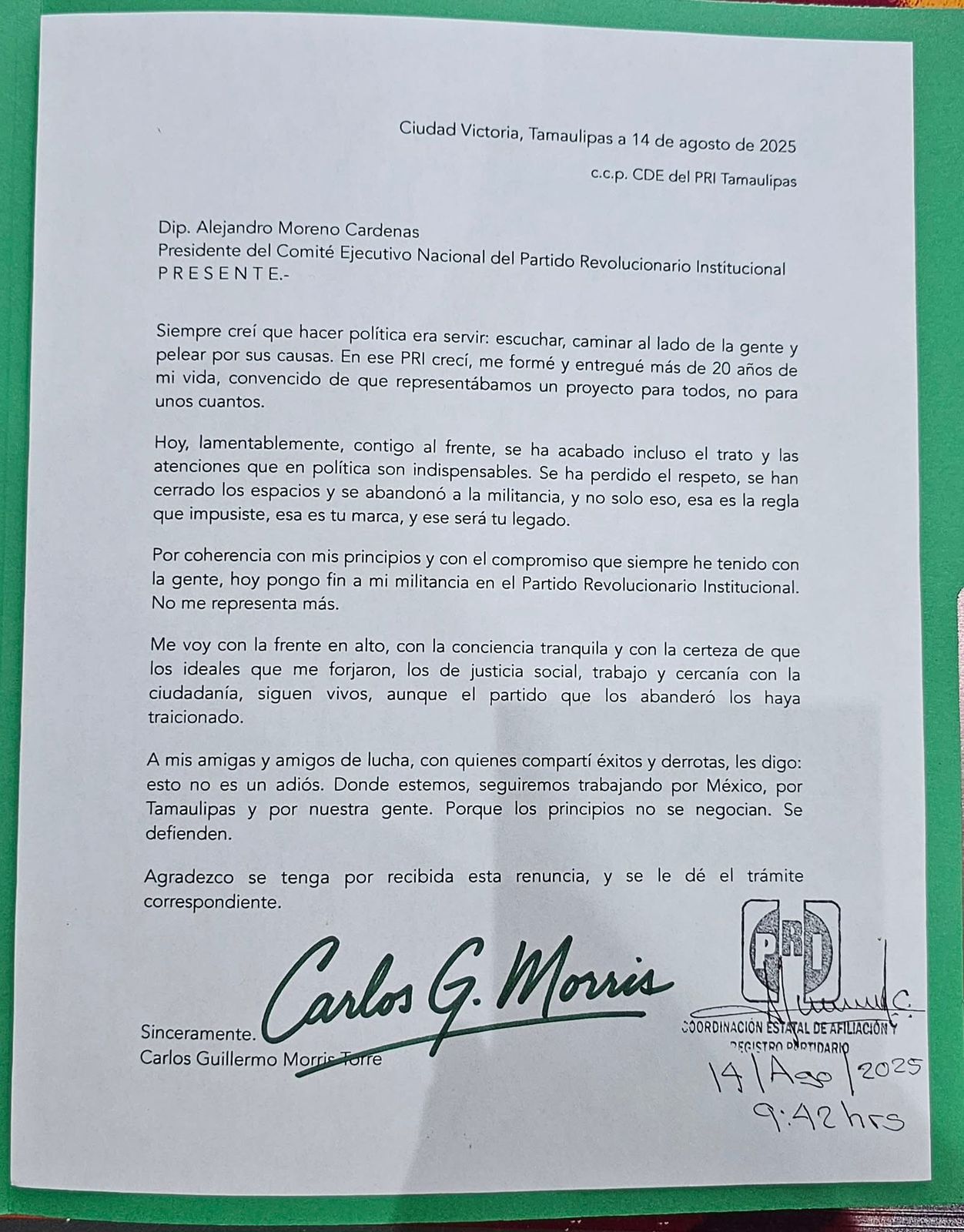 CIUDAD VICTORIA, TAAMAULIPAS. – Tras más de 20 años de militancia, el ex diputado local y ex dirigente municipal, Carlos Guillermo Morris Torre, dio a conocer su salida del Partido Revolucionario Institucional.