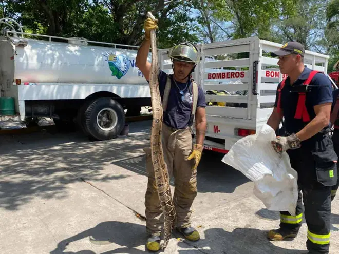 Bomberos de Veracruz capturaron una serpiente de dos metros que devoraba a un gato frente al DIF Municipal; fue liberada en una reserva natural.