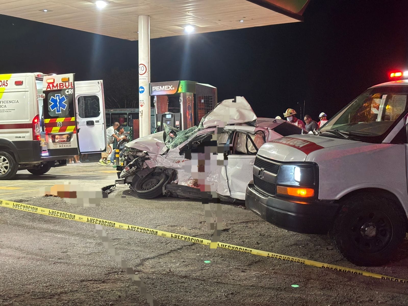 Tras el choque contra el tráiler el automóvil Versa salió proyectado y en su posición final quedó en una estación de servicio muy cerca de las bombas despachadoras de combustible.