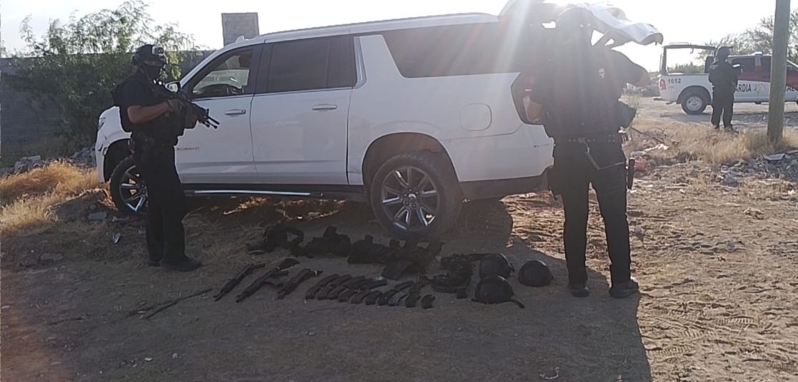 En su interior se encontraron tres armas largas calibre 5.56, 18 cargadores, tres cascos balísticos, tres chalecos tácticos y cartuchos cuyo número aún está pendiente de contabilizar.