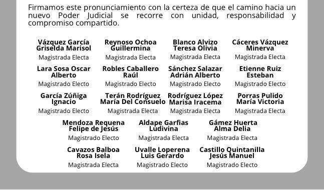 Asimismo, las y los magistrados electos enfatizaron que: “la transformación de la justicia está por comenzar y que este proceso requiere caminar por la vía institucional, sumar esfuerzos y actuar con responsabilidad para responder a la confianza depositada por la ciudadanía.”