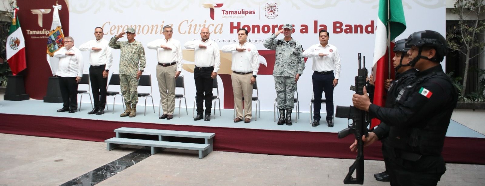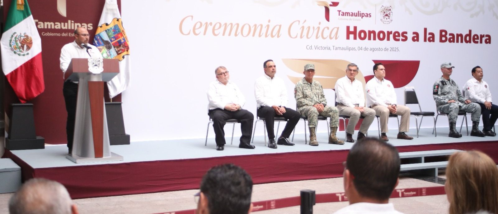 Al dar la bienvenida a la ceremonia cívica, Héctor Joel Villegas González, secretario General de Gobierno, hizo un llamado a las y los servidores públicos para seguir el ejemplo del gobernador Américo Villarreal y demostrar que “servir a Tamaulipas no es una tarea de escritorio, sino una causa que se lleva con orgullo, entrega y honestidad”.