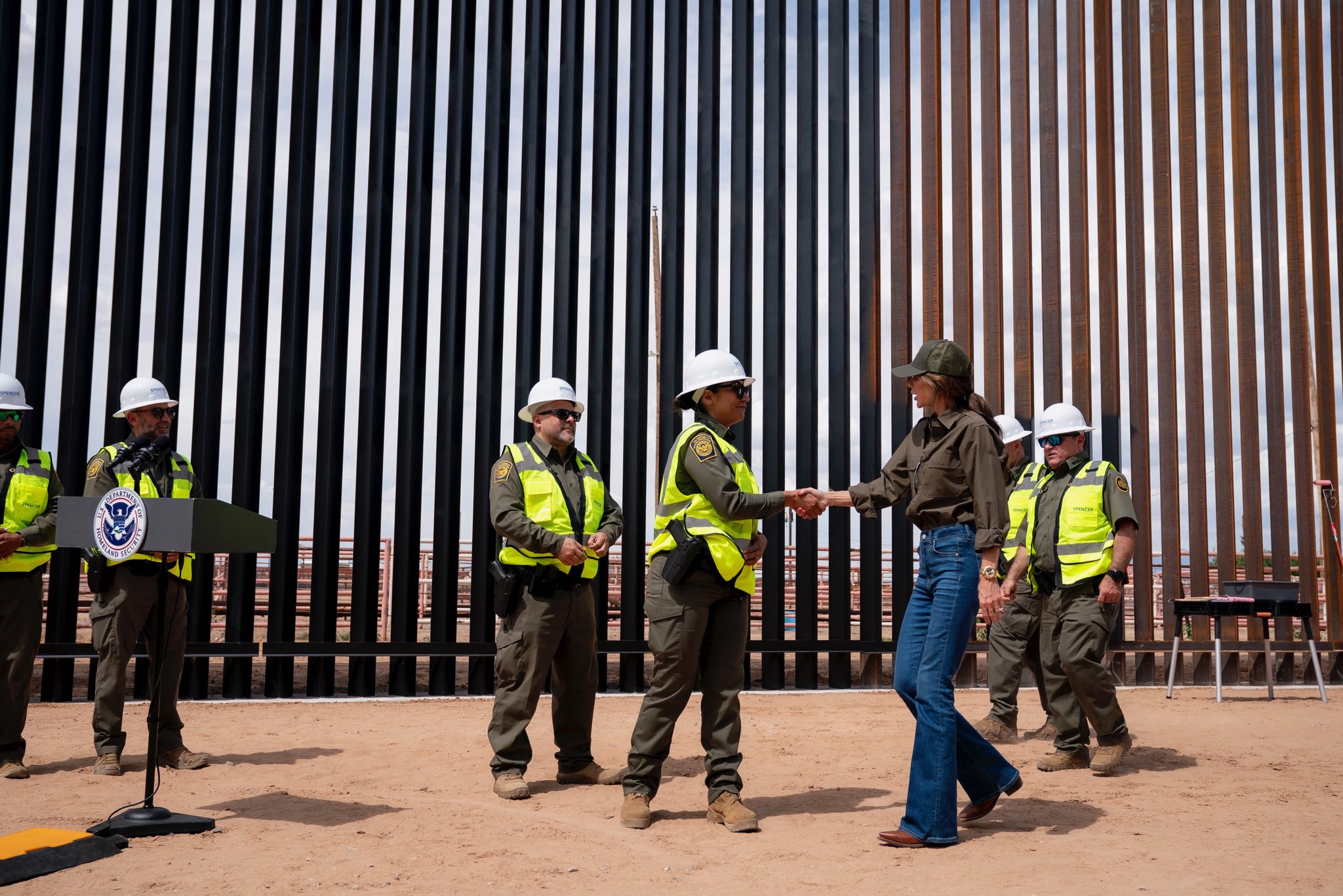 “Asegurando nuestra nación, protegiendo a nuestras comunidades. Gracias a la Secretaria Noem por su ayuda para terminar la sección del muro más reciente en El Paso, Texas”.
