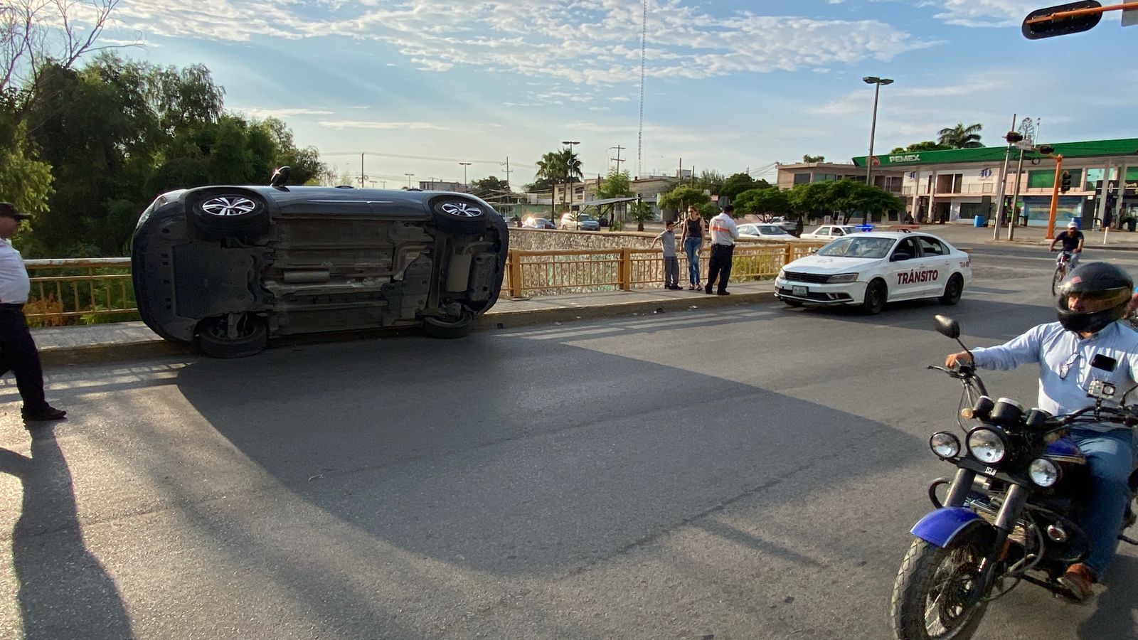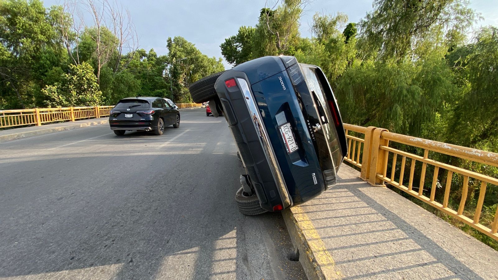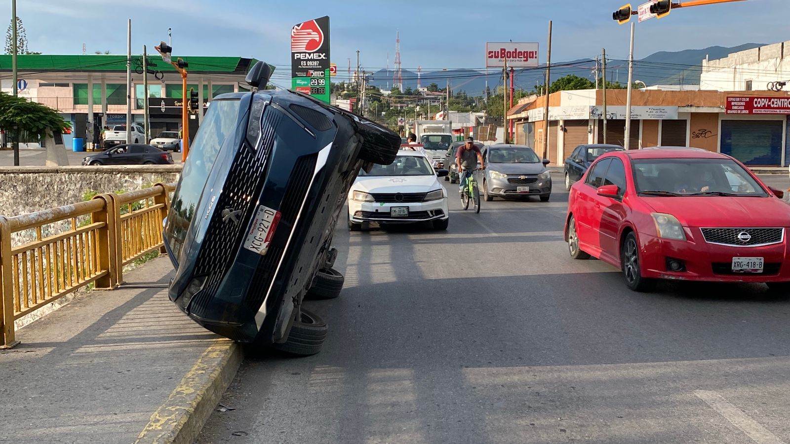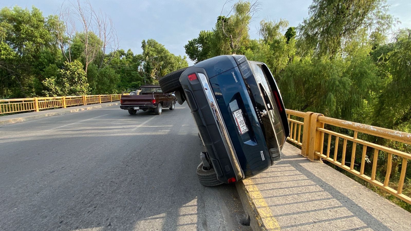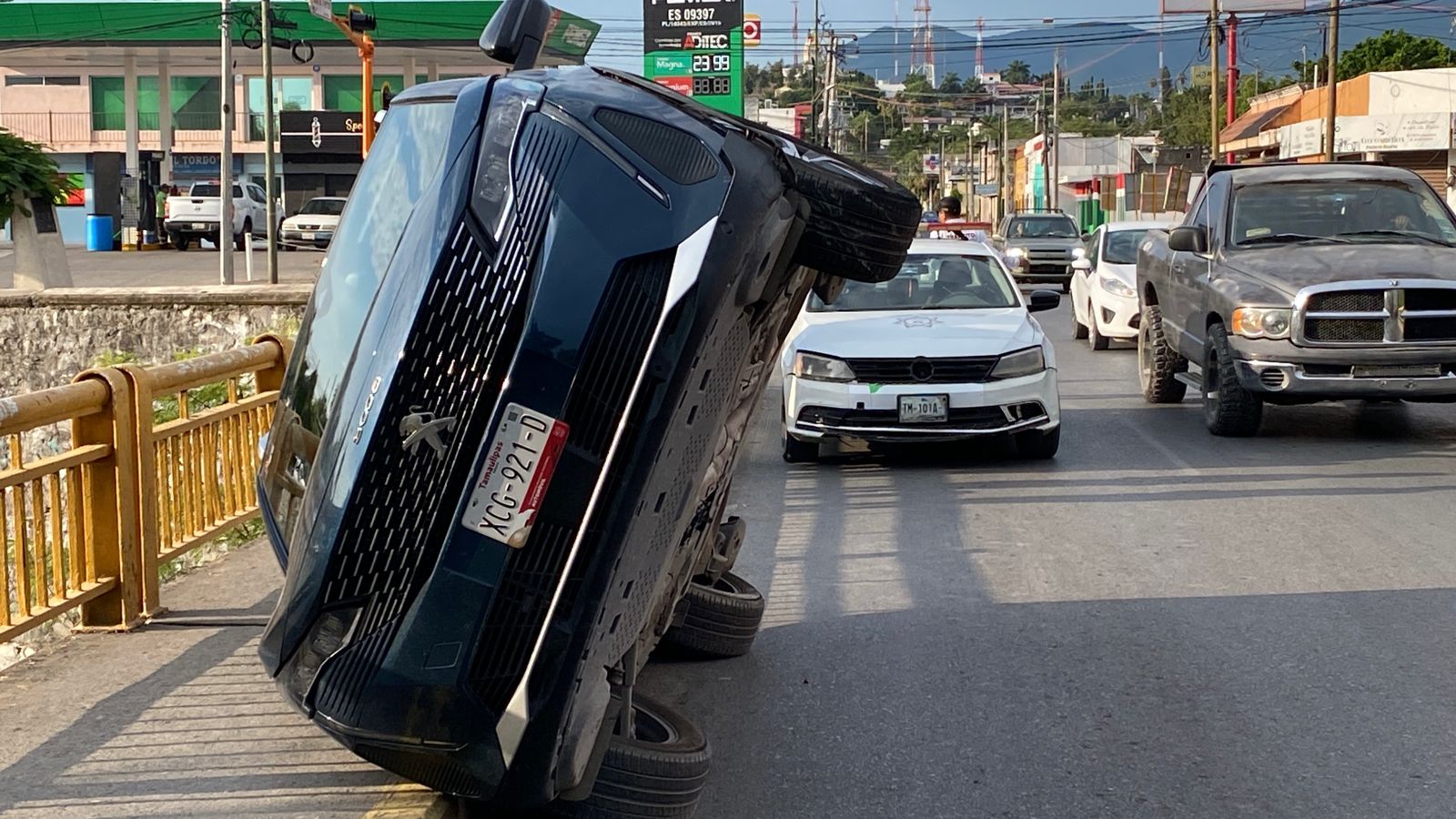 Ciudad Victoria, Tamaulipas (21 de agosto de 2025).- Esta mañana una camioneta quedó semi volcada sobre el puente vehicular de la calle 8, a unos pasos del Bulevar Praxedis Balboa.