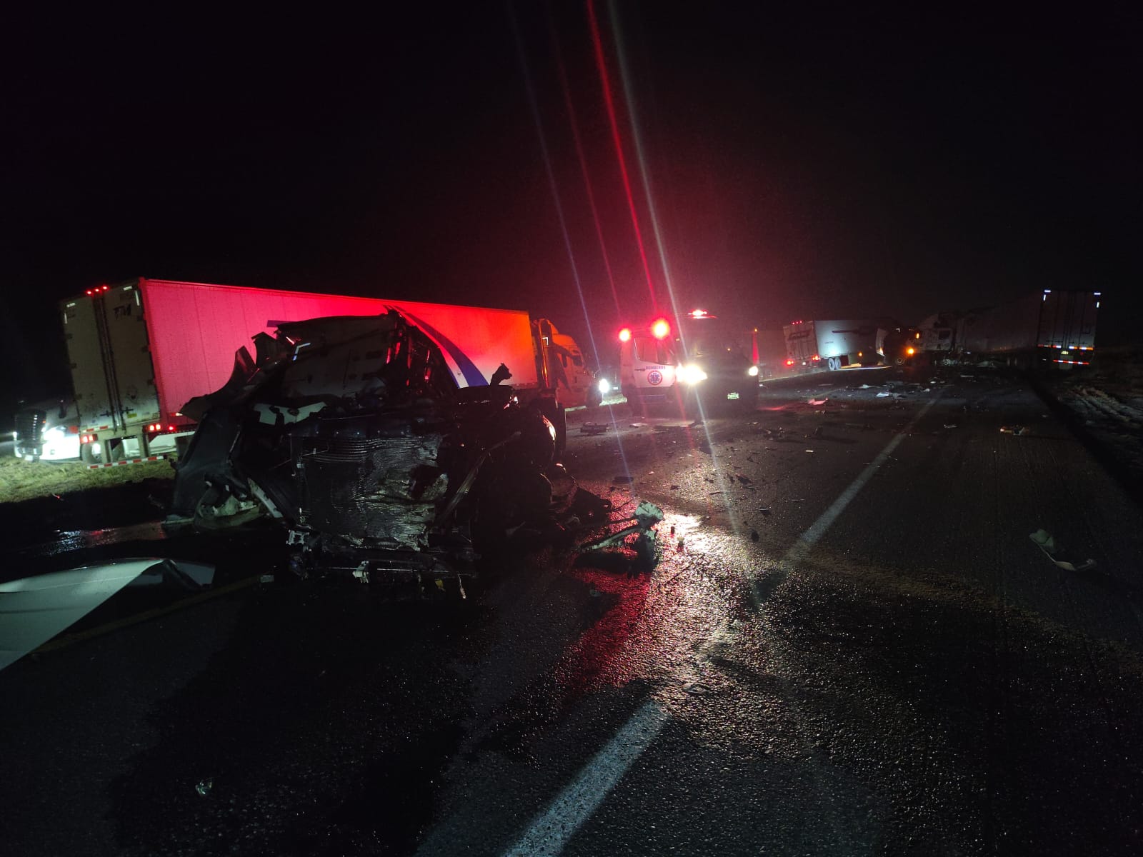 La unidad causante del impacto circulaba por el tramo libre, en sentido de norte a sur, con dirección a Monterrey, cuando intentó un rebase indebido en el que no logró reincorporarse a su carril, impactando con otro tractocamión que circulaba con dirección hacia Nuevo Laredo.